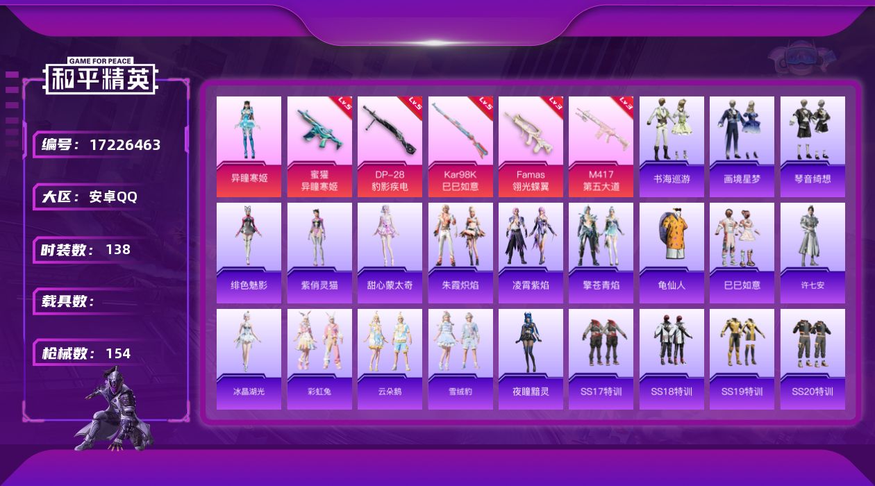 [17226463]安卓 手Q-1粉装-6特效枪-0载具-1粉色飞行器-43271热力值-8王牌印记-138套装-154枪皮 【热门品类】:套装-龟仙人 【粉色套装】:角色-异瞳寒姬 【粉色枪皮等级】:蜜獾-异瞳寒姬(五级),Famas-翎光蝶翼(三级),AKS-74U-森灵之息(五级),Kar98K-巳巳如意(五级),M417-第五大道(三级),DP-28-豹影疾电(五级) 【粉色枪皮】:蜜獾-异瞳寒姬,Famas-翎光蝶翼,AKS-74U-森灵之息,Kar98K-巳巳如意,M417-第五大道,DP-28-豹影疾电 【粉色降落伞】:星之彼岸降落伞,音爆索尼克降落伞,第五大道降落伞,翎光蝶翼降落伞,异瞳寒姬降落伞,炫彩糖果降落伞 【稀有套装】:套装-龟仙人,套装-巳巳如意,角色-甜心蒙太奇,套装-雪国风尚,套装-炫彩糖果,角色-许七安,角色-冰晶湖光,套装-彩虹兔,套装-云朵鹅,套装-雪绒豹,角色-夜瞳黯灵,套装-朱霞炽焰,套装-凌霄紫焰,套装-擎苍青焰,角色-绯色魅影,角色-紫俏灵猫,套装-书海巡游,套装-画境星梦,套装-琴音绮想,角色-月烬之祷 【稀有枪皮】:AUG-冰晶雪宝,AKM-彩虹符号,AKM-破晓战魂,AKM-虎虎生威,AKM-龙的传人,M16A4-幻世战舞者,M16A4-红色方程式,M16A4-蓝色火焰,SCAR-L-夜灯,SCAR-L-炫彩节奏,SCAR-L-玉兔迎春,SCAR-L-红色方程式,M416-糯团青竹,M416-红色方程式,M416-蓝色火焰,GROZA-懵萌河马,AUG-天降萌叽,AUG-耀粉歌者,QBZ-彩虹符号,M762-天降萌叽,M762-第五大道,M762-云朵鹅,M762-登顶巅峰,G36C-懵萌河马,AC-VAL-天降萌叽,蜜獾-天降萌叽,蜜獾-娇憨猪猪,蜜獾-绯穹魔姬,ACE32-画境星梦,ARX-凌霄紫焰,UZI-天降萌叽,UZI-娇憨猪猪,UZI-炫彩节奏,UZI-红色方程式,UMP45-夜灯,UMP45-生命誓言,UMP45-蓝色火焰,Vector-彩虹符号,Vector-生命誓言,汤姆逊-耀粉歌者,MP5K-画境星梦,AKS-74U-翎光蝶翼,JS9-凌霄紫焰,P90-巳巳如意,Kar98K-炫彩节奏,Kar98K-王子的夏天,SKS-迅猛狂鲨,VSS-彩虹符号,Mini14-炫彩节奏,Mini14-耀粉歌者,Mini14-绯穹魔