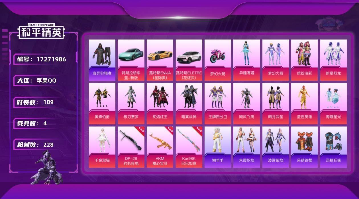 [17271986]苹果 手Q-14粉装-3特效枪-4载具-7粉色飞行器-82712热力值-9王牌印记-189套装-228枪皮