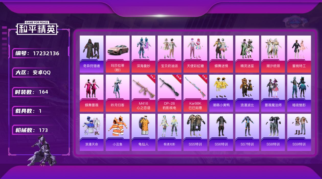 [17232136]安卓 手Q-9粉装-3特效枪-1载具-4粉色飞行器-61071热力值-5王牌印记-164套装-173枪皮