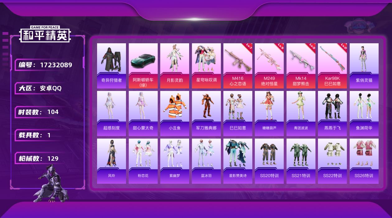 [17232089]安卓 手Q-2粉装-5特效枪-1载具-2粉色飞行器-42290热力值-6王牌印记-104套装-129枪皮