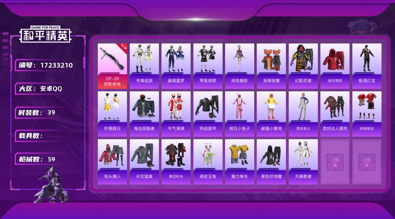 [17233210]安卓 手Q-0粉装-3特效枪-0载具-1粉色飞行器-14111热力值-2王牌印记-39套装-59枪皮 【粉色枪皮等级】:AKS-74U-森灵之息(五级),DP-28-豹影疾电(五级) 【粉色枪皮】:AKS-74U-森灵之息,Mk14-福马献瑞,DP-28-豹影疾电 【粉色飞行器】:炫彩糖果飞行器 【粉色降落伞】:异瞳寒姬降落伞,极意拳锋降落伞,炫彩糖果降落伞 【稀有套装】:套装-雪国风尚,角色-绯色魅影,套装-书海巡游,套装-画境星梦,套装-琴音绮想 【稀有枪皮】:AKM-破晓战魂,M16A4-幻世战舞者,SCAR-L-夜灯,SCAR-L-炫彩节奏,M762-牛气冲天,Mk47-洛神天依,ACE32-画境星梦,UMP45-夜灯,UMP45-生命誓言,UMP45-极意拳锋,Vector-彩虹符号,汤姆逊-天降萌叽,MP5K-画境星梦,Kar98K-红色方程式,M24-炫彩节奏,SKS-炫彩节奏,M1加兰德-画境星梦,S686-生命誓言,S12K-夜灯,S12K-幻世战舞者,AA12-G-画境星梦,M249-彩虹符号,MG3-幻世战舞者,平底锅-画境星梦 【其他套装】:套装-幻影武者,套装-旭日情侣,套装-极速红龙,套装-柠萌假日,套装-海岛探路者,套装-牛气满满,套装-特战装甲,套装-疯狂小兔子,套装-破蛋小黄鸡,套装-竞技名士,套装-竞技达人朋克,套装-绯格组合,套装-街头潮人,套装-长空猛禽,套装-青涩时光,套装-顽皮玉兔,套装-魅力单车,套装-黑色伏地魔,套装-呆萌铁蟹,套装-天籁歌者 【稀有背包】:深海小丑鱼背包(2级) 【营地ID】:728668395