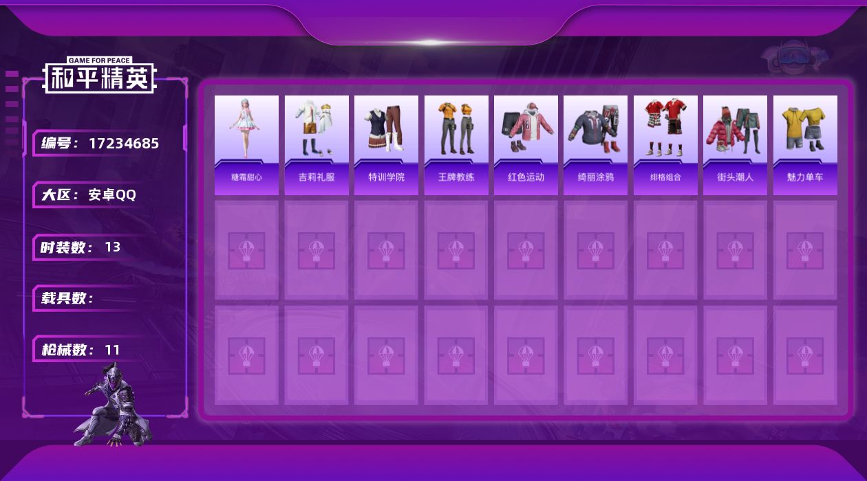 [17234685]安卓 手Q-0粉装-2特效枪-0载具-0粉色飞行器-3031热力值-0王牌印记-13套装-11枪皮 【粉色枪皮】:Mk14-福马献瑞 【粉色降落伞】:樱桃泡泡降落伞 【稀有套装】:角色-糖霜甜心 【稀有枪皮】:蜜獾-天降萌叽,UMP45-生命誓言,S686-千金淑猫,MG3-第五大道 【其他套装】:套装-吉莉礼服,套装-特训学院,套装-王牌教练,套装-红色运动,套装-绮丽涂鸦,套装-绯格组合,套装-街头潮人,套装-魅力单车 【营地ID】:1042467903
