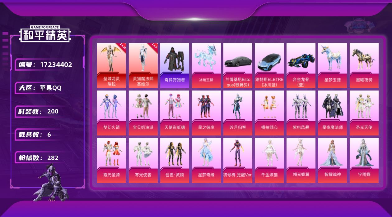 [17234402]苹果 手Q-2神装-21粉装-24特效枪-6载具-11粉色飞行器-110506热力值-11王牌印记-200套装-282枪皮