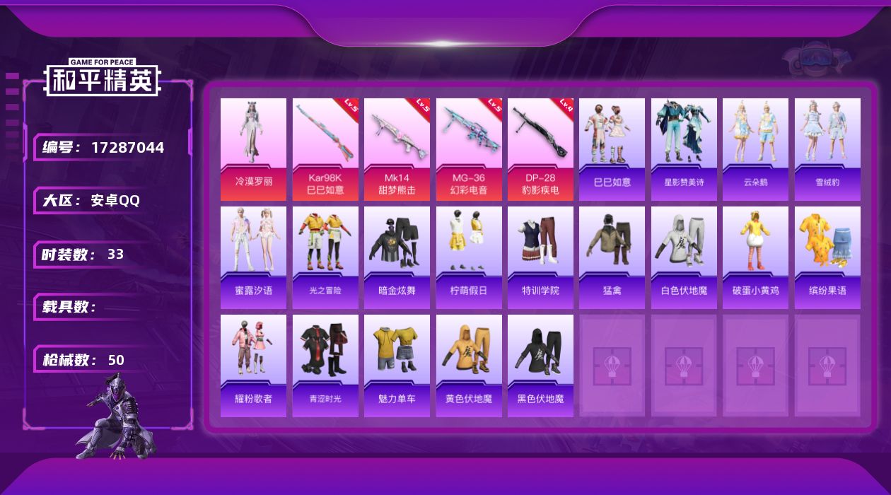[17287044]安卓 手Q-1粉装-4特效枪-0载具-0粉色飞行器-13262热力值-2王牌印记-33套装-50枪皮 【粉色套装】:角色-冷漠罗丽 【粉色枪皮等级】:Kar98K-巳巳如意(五级),Mk14-甜梦熊击(五级),DP-28-豹影疾电(四级),MG-36-幻彩电音(五级) 【粉色枪皮】:Kar98K-巳巳如意,Mk14-甜梦熊击,DP-28-豹影疾电,MG-36-幻彩电音 【粉色降落伞】:雪月幻音降落伞,星穹咏叹调降落伞 【稀有套装】:套装-巳巳如意,套装-星影赞美诗,套装-云朵鹅,套装-雪绒豹,套装-蜜露汐语 【稀有枪皮】:SCAR-L-冷漠罗丽,AUG-耀粉歌者,M762-云朵鹅,蜜獾-绯穹魔姬,UZI-天降萌叽,P90-巳巳如意,SKS-炫彩节奏,M417-幻影飞狐,SVD-云朵鹅,SVD-冷漠罗丽,S686-巳巳如意,S686-千金淑猫,DBS-荧海星豚,SPAS-12-云朵鹅,M249-糯团青竹,MG3-幻世战舞者,沙漠之鹰-云朵鹅,大砍刀-云朵鹅,撬棍-冷漠罗丽,破片手榴弹-巳巳如意 【其他套装】:套装-光之冒险,套装-暗金炫舞,套装-柠萌假日,套装-特训学院,套装-猛禽,套装-白色伏地魔,套装-破蛋小黄鸡,套装-缤纷果语,套装-耀粉歌者,套装-青涩时光,套装-魅力单车,套装-黄色伏地魔,套装-黑色伏地魔 【营地ID】:997864478