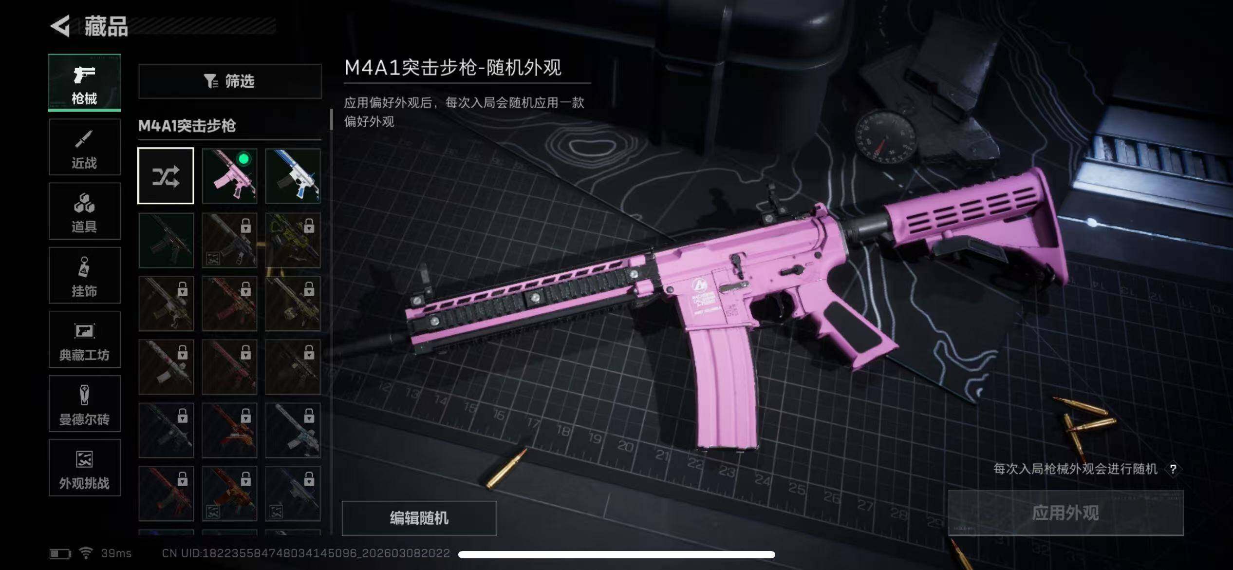 【普通外观】:M4A1突击步枪-粉色涂装,M4A1突击步枪-高雅黑,M4A1突击步枪-海色,QBZ95-1突击步枪-海浪,QBZ95-1突击步枪-2026,腾龙突击步枪-三角洲力量,K416突击步枪-几何迷彩,K416突击步枪-高雅黑,AUG突击步枪-浅蓝涂装,M7战斗步枪-黑巧甜心,SG552突击步枪-海浪,SG552突击步枪-狂欢,SCAR-H战斗步枪-数码迷彩,G3战斗步枪-高雅黑,PTR-32突击步枪-黄蜂,CAR-15突击步枪-狂欢,AS Val突击步枪-黑巧甜心,MP5冲锋枪-海色,P90冲锋枪-黑巧甜心,Vector冲锋枪-几何迷彩,UZI冲锋枪-海色,UZI冲锋枪-狂欢,野牛冲锋枪-高雅黑,M1014霰弹枪-高雅黑,M1014霰弹枪-重击,PKM通用机枪-变色龙,M249轻机枪-黄蜂,QJB201轻机枪-典雅,SR-25射手步枪-黄蜂,SR-25射手步枪-黑巧甜心