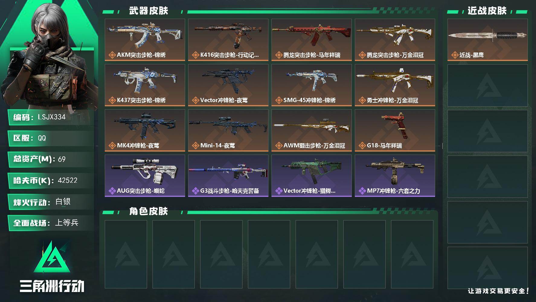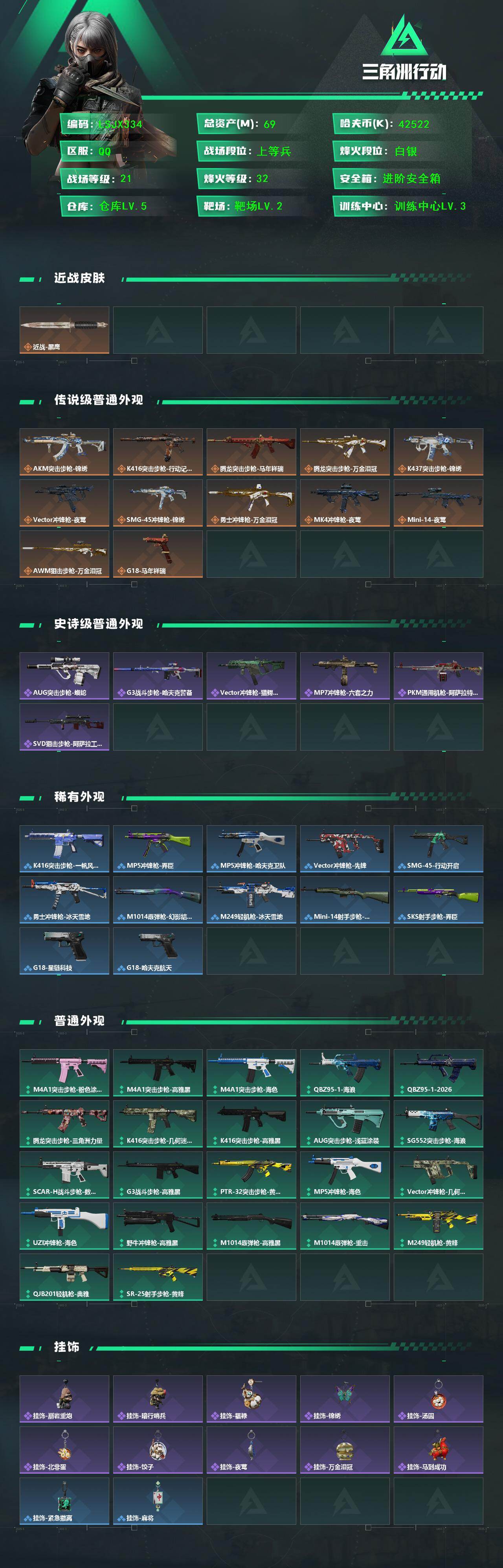 [17470622]【特价出售/店主推荐】69m总资产-42522k哈伏币-32烽火等级-白银-21战场等级-上等兵 【近战皮肤】:近战-黑鹰 【传说外观】:AKM突击步枪-锦绣,K416突击步枪-行动记录,腾龙突击步枪-马年祥瑞,腾龙突击步枪-万金泪冠,K437突击步枪-锦绣,Vector冲锋枪-夜莺,SMG-45冲锋枪-锦绣,勇士冲锋枪-万金泪冠,MK4冲锋枪-夜莺,Mini-14射手步枪-夜莺,AWM狙击步枪-万金泪冠,G18-马年祥瑞 【史诗外观】:AUG突击步枪-蝮蛇,G3战斗步枪-哈夫克警备,Vector冲锋枪-猎鳄行动,MP7冲锋枪-六套之力,PKM通用机枪-阿萨拉特攻,SVD狙击步枪-阿萨拉工艺 【稀有外观】:K416突击步枪-一帆风顺,MP5冲锋枪-弄臣,MP5冲锋枪-哈夫克卫队,Vector冲锋枪-先锋,SMG-45冲锋枪-行动开启,勇士冲锋枪-冰天雪地,M1014霰弹枪-幻影结构,M249轻机枪-冰天雪地,Mini-14射手步枪-荣耀列队,SKS射手步枪-弄臣,QSZ92G-一帆风顺,G18-星链科技,G18-哈夫克航天 【普通外观】:M4A1突击步枪-粉色涂装,M4A1突击步枪-高雅黑,M4A1突击步枪-海色,QBZ95-1突击步枪-海浪,QBZ95-1突击步枪-2026,腾龙突击步枪-三角洲力量,K416突击步枪-几何迷彩,K416突击步枪-高雅黑,AUG突击步枪-浅蓝涂装,M7战斗步枪-黑巧甜心,SG552突击步枪-海浪,SG552突击步枪-狂欢,SCAR-H战斗步枪-数码迷彩,G3战斗步枪-高雅黑,PTR-32突击步枪-黄蜂,CAR-15突击步枪-狂欢,AS Val突击步枪-黑巧甜心,MP5冲锋枪-海色,P90冲锋枪-黑巧甜心,Vector冲锋枪-几何迷彩,UZI冲锋枪-海色,UZI冲锋枪-狂欢,野牛冲锋枪-高雅黑,M1014霰弹枪-高雅黑,M1014霰弹枪-重击,PKM通用机枪-变色龙,M249轻机枪-黄蜂,QJB201轻机枪-典雅,SR-25射手步枪-黄蜂,SR-25射手步枪-黑巧甜心 【挂饰】:挂饰-崩岩重炮*2,挂饰-暗行哨兵*2,挂饰-福禄*3,挂饰-锦绣,挂饰-汤圆,挂饰-北非蛋,挂饰-饺子,挂饰-夜莺,挂饰-万金泪冠,挂饰-马到成功,挂饰-紧急撤离*6,挂饰-麻将*7