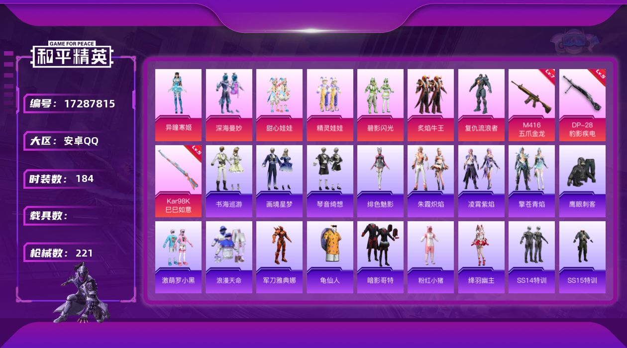 - [11883590]2粉装 4特效枪 1载具 10印记 可二次 可修改实名 优质装备:AKM炫紫旋律,M416五爪金龙,M416心之恋语,智能音符,M762激战未来,锦绣火鲤 热门装扮:软萌银虎,蔷薇魔法师,暗夜魅影 载具:鬼马风驰 五级特效枪:五级M762-激战未来,五级Kar98K-伏魔团,五级M416-五爪金龙 四级特效枪:四级M416-心之恋语 紫色装扮:SS22特训,SS21特训,六六大吉,冰川特警,冷焰舞者,SS20特训,青春冒险家,潮流游乐家,SS15特训,鹤发童颜,时空追击者,暴风机械师,SS16特训,快乐星愿,银白舞王,SS13特训,治愈之星,迅捷之星,科技之星,SS14特训,萌趣颜团子,特种颜团子,飞驰魅影,音速流光,SS19特训,吉莉礼服,雪兔飞飞,瑞龙福将,团圆交子,SS17特训,SS18特训,都市漫游者,长空猛禽,耀眼新星,蓝色运动,虎虎生威吉莉,飞行日记,魅力单车,黎明保卫者,朋克治安官,极速红龙,格斗先锋,滨海假日,夏日音浪,幻世战舞者,怒火燎原,湖蓝色名流,滨海厨神,白熊同盟,破晓战魂,神秘领域,甜蜜告白,福星高照,牛气冲天,灰色格斗者,炫蓝之夏,热血青春,牛气满满,特战装甲,特殊使命,特训学院,狂沙舞者,镭射皇者,竞技名士,SS24特训(SS24特训套装),金羽特工,萌主吾皇,摇滚狂鲨,迷域探索者,玲珑飞花,SS8特训,丝绸行者,神秘舞者,粉甜马卡龙,白虎圣者,原初圣火,逆风勇士,SS12特训,韶华初心,辉星之火,纯白誓言,众神之王,智慧之神,SS9特训,舞夜骑士,风华少年志,SS10特训,暗夜契约,机械英豪,机械征服者,SS11特训,萌黄之夏,金耀舞者,蓝调潮人,贵族骑装,街舞达人,街舞之王,海上生明月 优质战备:炫紫旋律降落伞,繁花小夜曲降落伞,飞行器-心之恋语(心之恋语飞行翼),扶摇飞仙降落伞,潮汐统领降落伞,阿狸红降落伞,心之恋语降落伞,香水柠檬降落伞