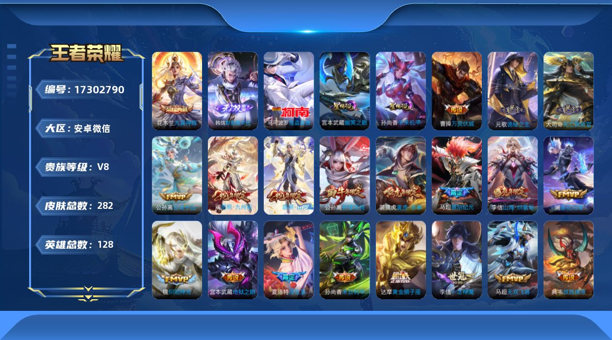 [17302790]安卓WX-V8-永恒钻石I段位-128英雄-282皮肤-1典藏皮肤-1无双-1珍品传说-31传说-90史诗