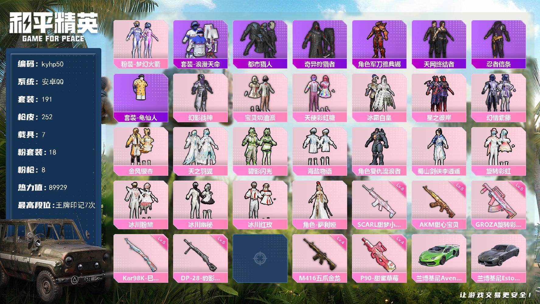 [17472423]安卓 手Q-18粉装-8特效枪-7载具-6粉色飞行器-89929热力值-7王牌印记-191套装-252枪皮