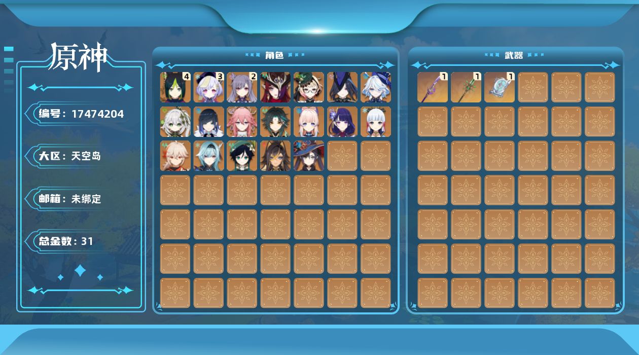 0命克洛琳德,0命芙宁娜,0命迪希雅,0命纳西妲,4命提纳里,0命夜兰,0命八重神子,0命优菈,0命雷电将军,0命枫原万叶,0命神里绫华,0命魈,0命温迪,0命珊瑚宫心海,2命刻晴,3命七七,0命莫娜,0命艾梅莉埃,0命恰斯卡,精1薙草之稻光,精1四风原典,精1和璞鸢