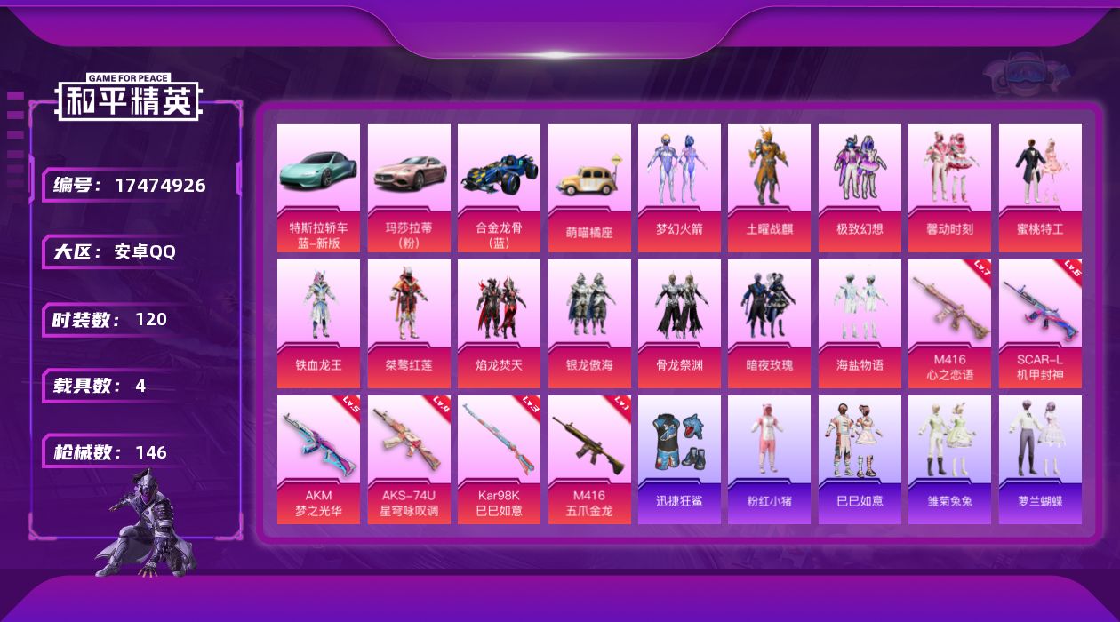 [17474926]可二次【特价出售/店主推荐】安卓 手Q-12粉装-6特效枪-4载具-2粉色飞行器-52662热力值-9王牌印记-120套装-146枪皮 【热门品类】:粉装-梦幻火箭,套装-粉红小猪 【粉色套装】:粉装-土曜战麒,粉装-梦幻火箭,粉装-极致幻想,粉装-馨动时刻,粉装-蜜桃特工,粉装-铁血龙王,粉装-桀骜红莲,粉装-焰龙焚天,粉装-银龙傲海,粉装-骨龙祭渊,粉装-暗夜玫瑰,粉装-海盐物语 【粉色枪皮等级】:AKM-梦之光华(五级),SCAR-L-机甲封神(六级),M416-五爪金龙(一级),M416-心之恋语(七级),AKS-74U-星穹咏叹调(四级),Kar98K-巳巳如意(三级) 【粉色载具】:特斯拉Roadster(水滴蓝),玛莎拉蒂Ghibli(粉),合金龙骨(蓝),萌喵橘座 【粉色枪皮】:AKM-梦之光华,SCAR-L-机甲封神,M416-五爪金龙,M416-心之恋语,AKS-74U-星穹咏叹调,Kar98K-巳巳如意 【粉色飞行器】:梦之光华飞行器,机甲封神飞行器 【粉色降落伞】:甜心宝贝降落伞,至尊龙雀降落伞,梦幻火箭降落伞,童趣迷兔降落伞,王牌四分卫降落伞,机甲封神降落伞,焰龙焚天降落伞,风花雪月降落伞,环太平洋降落伞,魔法神域降落伞,时空协奏降落伞,月影灵韵降落伞,幻彩电音降落伞 【稀有套装】:套装-巳巳如意,套装-雏菊兔兔,套装-萝兰蝴蝶,角色-多纳泰罗,套装-糖糖葫芦,套装-青团波波,套装-粉恋花,套装-紫幽梦,套装-蓝冰羽 【稀有枪皮】:AKM-彩虹符号,AKM-萌趣颜团子,AKM-虎虎生威,M16A4-幻世战舞者,M16A4-甜心亚梦,SCAR-L-炫彩节奏,SCAR-L-玉兔迎春,SCAR-L-王牌四分卫,M416-糯团青竹,M416-蓝色火焰,GROZA-林间仙鹿,GROZA-治愈之星,AUG-焰龙焚天,AUG-青春冒险家,QBZ-彩虹符号,QBZ-暗翼战神,QBZ-赛罗,QBZ-飞驰魅影,M762-天降萌叽,M762-深海曼妙,M762-瑞龙福将,Mk47-青春冒险家,G36C-时空追击者,G36C-暗夜玫瑰,AC-VAL-甜心亚梦,蜜獾-天降萌叽,UZI-天降萌叽,UZI-炫彩节奏,UZI-烈焰拳霸,UZI-红色方程式,UMP45-时空追击者,UMP45-生命誓言,UMP45-蓝色火焰,Vector-暗夜玫瑰,Vector-治愈之星,