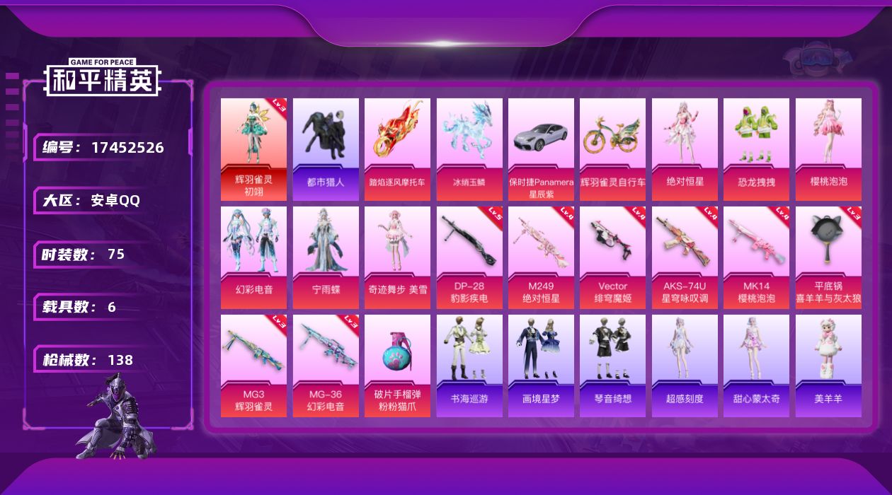 [17452526]安卓 手Q-1神装-7粉装-13特效枪-6载具-9粉色飞行器-53496热力值-5王牌印记-75套装-138枪皮 【红色神装等级】:辉羽雀灵-初翊(三级) 【红色角色神装】:辉羽雀灵-初翊 【热门品类】:套装-都市猎人 【粉色套装】:角色-绝对恒星,粉装-恐龙拽拽,角色-樱桃泡泡,粉装-幻彩电音,角色-宁雨蝶,角色-奇迹舞步 美雪,角色-罪夜之冕 【粉色枪皮等级】:AKM-暮色玫影(三级),AUG-罪夜之冕(五级),UMP45-萌骑冒险(三级),Vector-绯穹魔姬(四级),AKS-74U-星穹咏叹调(四级),Mk14-樱桃泡泡(四级),Mk14-福马献瑞(四级),M249-绝对恒星(四级),DP-28-豹影疾电(五级),MG3-辉羽雀灵(三级),MG-36-幻彩电音(三级),平底锅-喜羊羊与灰太狼(三级) 【粉色载具】:保时捷Panamera(星辰紫),踏焰逐风摩托车,僚机-圣域龙宝,冰绡玉鳞,暮色幽蹄,霜月冰狼,辉羽雀灵自行车 【粉色枪皮】:AKM-暮色玫影,AUG-罪夜之冕,UMP45-萌骑冒险,Vector-绯穹魔姬,AKS-74U-星穹咏叹调,Mk14-樱桃泡泡,Mk14-福马献瑞,M249-绝对恒星,DP-28-豹影疾电,MG3-辉羽雀灵,MG-36-幻彩电音,平底锅-喜羊羊与灰太狼,破片手榴弹-粉粉猫爪 【粉色飞行器】:绝对恒星飞行器,炫彩糖果飞行器,雀灵庇佑飞行器,御兔特攻飞行器,终晖之翼飞行器,灵猫魔法师飞行器,飞天猪飞行器,暮色之舞飞行器,冰狼掠影飞行器 【粉色降落伞】:绝对恒星降落伞,恐龙拽拽降落伞,樱桃泡泡降落伞,星穹咏叹调降落伞,辉羽雀灵降落伞,幻彩电音降落伞,冷漠罗丽降落伞,绯穹魔姬降落伞,喜羊羊与灰太狼降落伞,魔童闹海 敖丙降落伞,炫彩糖果降落伞,暮色玫影降落伞,罪夜之冕降落伞,灵驹仙姬降落伞 【稀有套装】:角色-超感刻度,角色-甜心蒙太奇,套装-雪国风尚,套装-炫彩糖果,套装-马上来财,角色-糖霜甜心,角色-蜜桃派对,套装-粉恋花,套装-紫幽梦,套装-蓝冰羽,套装-霓虹热舞,套装-极速光影,套装-彩虹兔,套装-云朵鹅,套装-雪绒豹,套装-蜜露汐语,角色-夜瞳黯灵,套装-朱霞炽焰,套装-凌霄紫焰,套装-擎苍青焰,玩偶服-美羊羊,套装-书海巡游,套装-画境星梦,套装-琴音绮想,角色-霜刃之御,角色-月烬之祷,套装-粉彩缠枝,套装-雨过