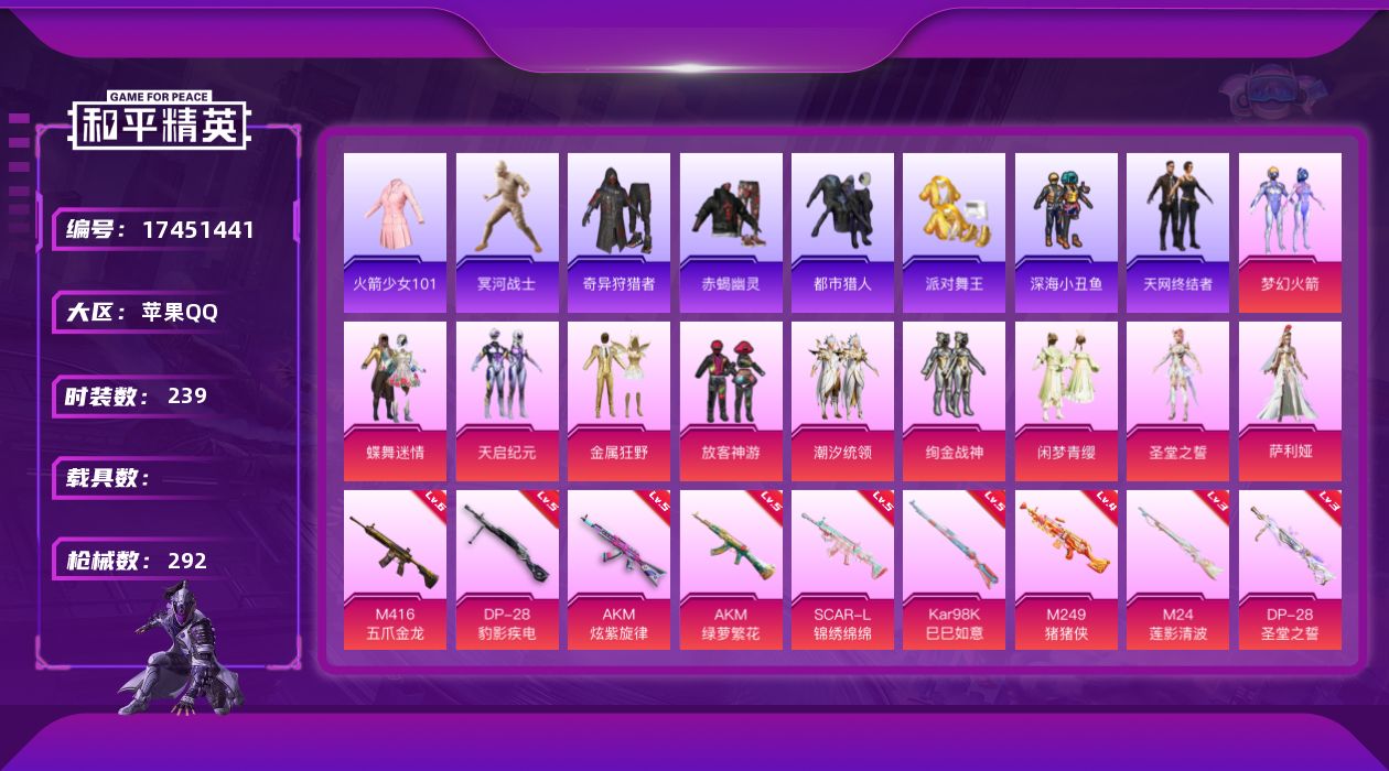 [17451441]苹果 手Q-10粉装-13特效枪-0载具-7粉色飞行器-96750热力值-12王牌印记-239套装-292枪皮