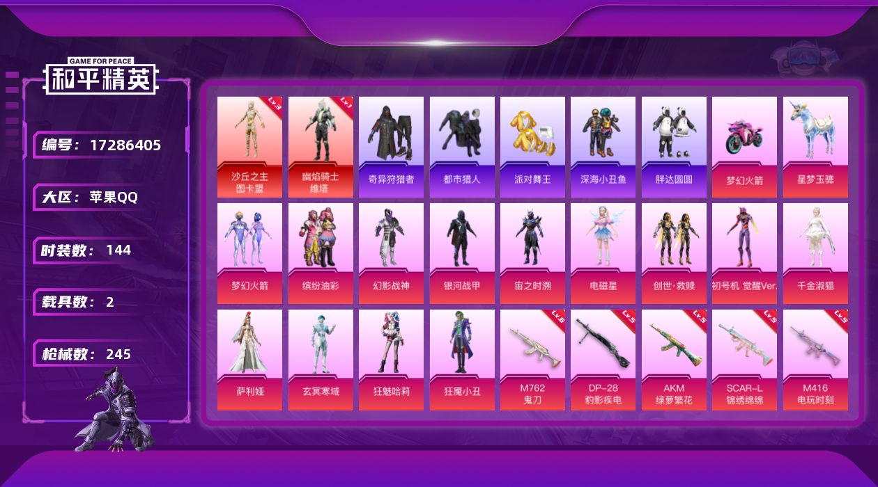 [17286405]苹果 手Q-2神装-13粉装-19特效枪-2载具-7粉色飞行器-83104热力值-12王牌印记-144套装-245枪皮