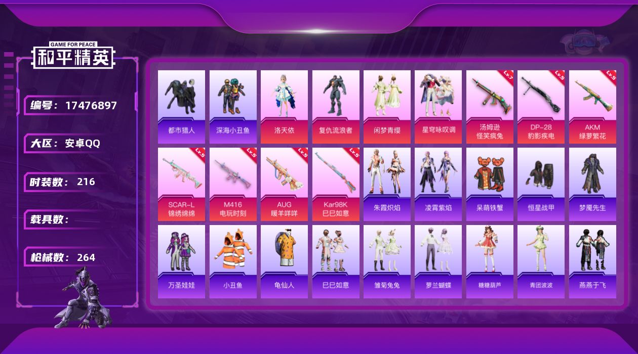 [17476897]安卓 手Q-5粉装-7特效枪-0载具-2粉色飞行器-80083热力值-14王牌印记-216套装-264枪皮 【热门品类】:套装-都市猎人,套装-深海小丑鱼,套装-小丑鱼,套装-龟仙人 【粉色套装】:角色-洛天依,角色-复仇流浪者,粉装-闲梦青缨,粉装-星穹咏叹调,角色-罪夜之冕 【粉色枪皮等级】:AKM-绿萝繁花(五级),SCAR-L-锦绣绵绵(五级),M416-电玩时刻(五级),AUG-暖羊咩咩(五级),汤姆逊-怪笑疯兔(七级),Kar98K-巳巳如意(五级),DP-28-豹影疾电(五级) 【粉色枪皮】:AKM-绿萝繁花,SCAR-L-锦绣绵绵,M416-电玩时刻,AUG-暖羊咩咩,汤姆逊-怪笑疯兔,Kar98K-巳巳如意,DP-28-豹影疾电 【粉色飞行器】:齐天大圣飞行器,绝色倾城飞行器 【粉色降落伞】:金风玉露降落伞,神秘黑猫降落伞,马卡龙降落伞,暗夜玫瑰降落伞,齐天大圣降落伞,临安公主降落伞,星穹咏叹调降落伞,辉羽雀灵降落伞,湮灭星辰降落伞,幻星舰长降落伞,幻彩电音降落伞,时光之吻降落伞,炫彩糖果降落伞 【稀有套装】:套装-龟仙人,套装-巳巳如意,套装-雪国风尚,套装-雏菊兔兔,套装-萝兰蝴蝶,套装-糖糖葫芦,套装-青团波波,套装-燕燕于飞,套装-鱼渊荷华,角色-风玲,套装-旋风灵鼠,套装-粉恋花,套装-紫幽梦,套装-蓝冰羽,套装-星影赞美诗,套装-虚空漩涡,套装-霓虹热舞,套装-云朵鹅,套装-雪绒豹,套装-诡诞巡游,角色-玫纹锢梦,角色-夜瞳黯灵,套装-朱霞炽焰,套装-凌霄紫焰 【稀有枪皮】:AKM-夜灯,AKM-灼热熔岩,AKM-生命誓言,AKM-破晓战魂,AKM-缤纷海域,AKM-萌趣颜团子,AKM-虎虎生威,AKM-霓虹街区,AKM-龙的传人,M16A4-幻世战舞者,M16A4-生命誓言,M16A4-红色方程式,M16A4-蓝色火焰,SCAR-L-炫彩节奏,SCAR-L-玉兔迎春,SCAR-L-红色方程式,M416-夜灯,M416-滑板小狐,M416-糯团青竹,M416-红色方程式,M416-绯红前夜,M416-蓝色火焰,AUG-天降萌叽,AUG-耀粉歌者,AUG-青春冒险家,AUG-绝对恒星,QBZ-原初圣火,QBZ-诡娃娃,M762-天降萌叽,M762-牛气冲天,M762-诡娃娃,M762-镭射皇者,M762-云朵鹅,Mk47-青春冒险家,M