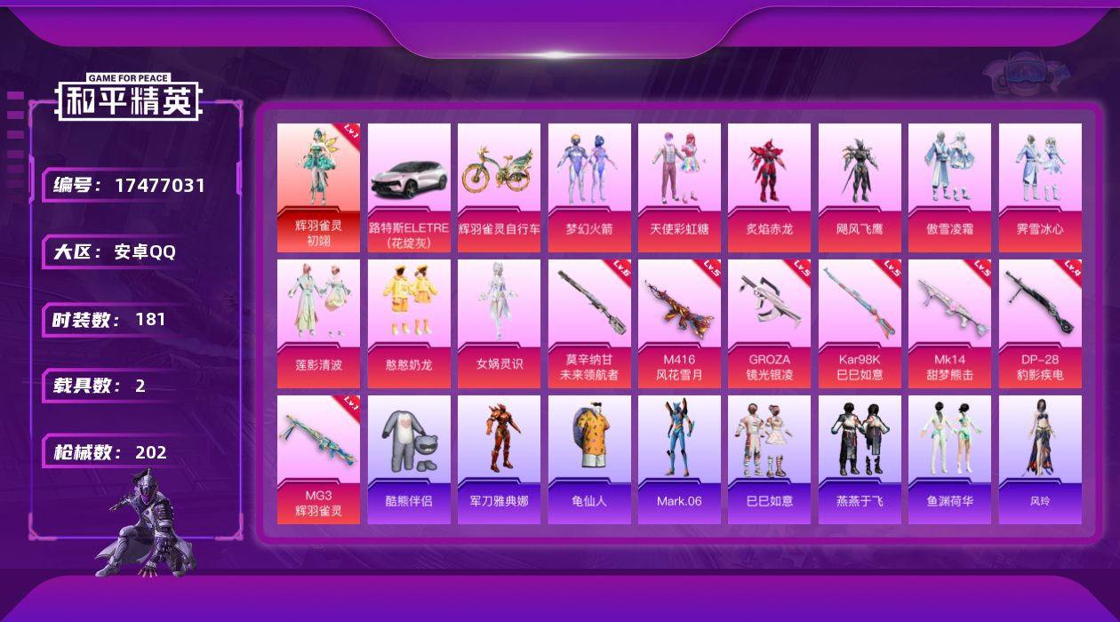 [17477031]安卓 手Q-1神装-9粉装-7特效枪-2载具-2粉色飞行器-67837热力值-6王牌印记-181套装-202枪皮 【红色神装等级】:辉羽雀灵-初翊(一级) 【红色角色神装】:辉羽雀灵-初翊 【热门品类】:粉装-梦幻火箭,角色-军刀雅典娜,套装-龟仙人,角色-Mark.06 【粉色套装】:粉装-天使彩虹糖,粉装-梦幻火箭,粉装-炙焰赤龙,粉装-飓风飞鹰,粉装-傲雪凌霜,粉装-霁雪冰心,粉装-莲影清波,粉装-憨憨奶龙,角色-女娲灵识 【粉色枪皮等级】:M416-风花雪月(五级),GROZA-镜光银凌(五级),Kar98K-巳巳如意(五级),Mk14-甜梦熊击(五级),莫辛纳甘-未来领航者(六级),DP-28-豹影疾电(四级),MG3-辉羽雀灵(一级) 【粉色载具】:路特斯ELETRE(花绽灰),辉羽雀灵自行车 【粉色枪皮】:M416-风花雪月,GROZA-镜光银凌,Kar98K-巳巳如意,Mk14-甜梦熊击,莫辛纳甘-未来领航者,DP-28-豹影疾电,MG3-辉羽雀灵 【粉色飞行器】:雀灵庇佑飞行器 【粉色降落伞】:梦幻火箭降落伞,四圣焕新降落伞,古战神甲降落伞,齐天大圣降落伞,环太平洋降落伞,绒雪飘舞降落伞,垂柳戏鸭降落伞,太空嘟嘟降落伞,飒粉甜心降落伞,圣堂之誓降落伞,精灵梦叶罗丽降落伞,创世·救赎降落伞,辉羽雀灵降落伞,炫彩糖果降落伞 【稀有套装】:套装-龟仙人,套装-巳巳如意,套装-雪国风尚,套装-燕燕于飞,套装-鱼渊荷华,角色-风玲,套装-紫幽梦,套装-蓝冰羽,套装-霓虹热舞 【稀有枪皮】:AKM-冰凉西瓜,AKM-奇异狩猎者,AKM-破晓战魂,AKM-虎虎生威,AKM-龙的传人,M16A4-甜心亚梦,M16A4-生命誓言,M16A4-红色方程式,SCAR-L-玉兔迎春,SCAR-L-生命誓言,M416-圣诞惊喜,M416-糯团青竹,M416-红色方程式,M416-蓝色火焰,GROZA-懵萌河马,AUG-凝视深渊,AUG-天降萌叽,AUG-耀粉歌者,QBZ-原初圣火,QBZ-彩虹符号,QBZ-电玩视界,M762-天降萌叽,M762-牛气冲天,M762-瑞龙福将,M762-绒雪飘舞,M762-绯红前夜,M762-镭射皇者,Mk47-妙红点点,Mk47-洛神天依,G36C-懵萌河马,G36C-时空追击者,AC-VAL-快闪甜心,AC-VAL-甜心亚梦,蜜獾-垂柳