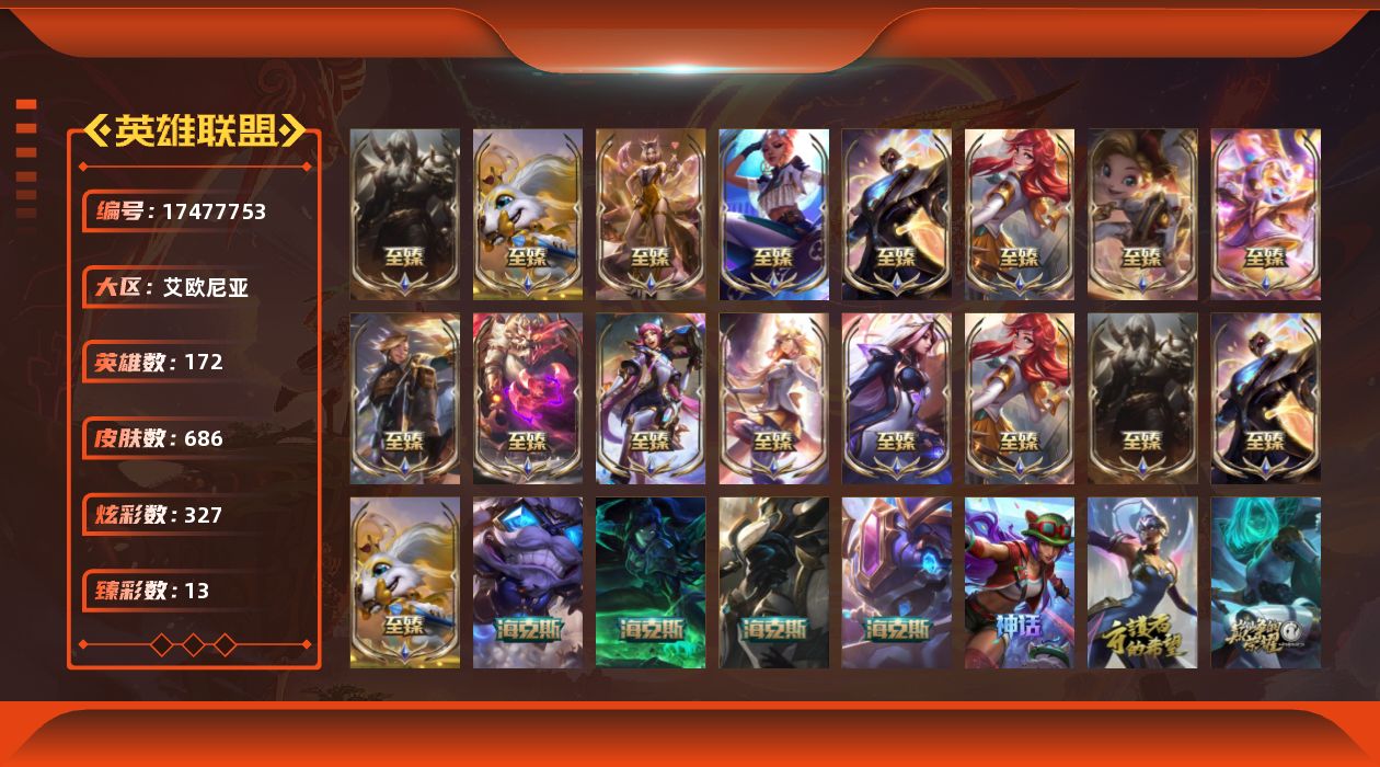 [17477753]铂金段位-172英雄-686皮肤-327炫彩-0终极-26神话-98限定-65传说-156史诗