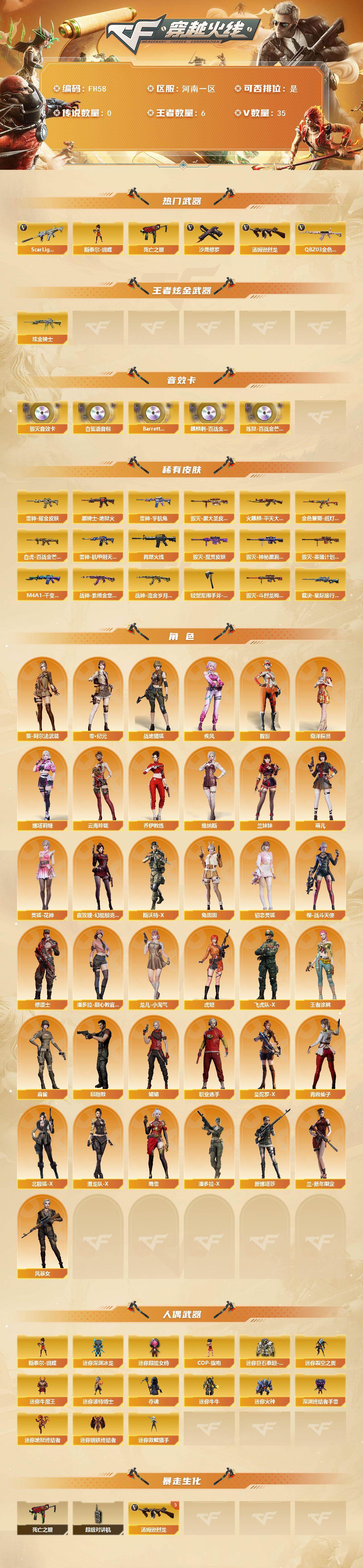 [17477881]河南一区-43V-6王者武器数-1炫金武器数 【热门武器】:QBZ03-金色蔷薇,Scar Light-白虎,死亡之眼,汤姆逊-烈龙*5,斯泰尔-蝴蝶,沙鹰-修罗*3 【王者炫金武器】:炫金骑士 【音效卡】:Barrett-毁灭音效卡,白鲨语音包,Barrett-碧霄极光音效卡,麒麟刺-百战金芒-盛典舞曲音效卡,炼狱-百战金芒-庆典舞曲音效卡 【皮肤】:白虎-百战金芒 皮肤,金色蔷薇-纸灯龙皮肤,裁决-星际旅行 皮肤,雷神-耀金皮肤,雷神-机甲刑天皮肤,雷神-宇航兔皮肤,M4A1-再燃火线,火麒麟-平天大圣,毁灭-黑大圣皮肤,毁灭-魔灵皮肤,毁灭-神秘黑洞皮肤,毁灭-英雄计划 皮肤,毁灭-斗烈龙驹 皮肤,M4A1-千变-孔明皮肤*2,黑骑士-地狱火,战神-紫绶金章皮肤,战神-流金岁月皮肤,轻型军用手斧-再燃火线 【角色】:零·纪元,战地猎狐,王者涂鸦,奇洋探员,乔伊教练,修道士,云海玲珑,葵-阿尔法武装,北极狐-X,初恋灵狐,飞虎队-X,风暴女,虎妞,疾风,娟娟,兰-新年限定,兰妹妹,灵狐-花神,龙儿-小淘气,麻雀,曼陀罗-X,萌儿,娜塔莉娅,潘多拉-X,潘多拉-甜心教官,潜龙队-X,邱刚敖,青霞仙子,斯沃特-X,蜀雪,兔囡囡,维纳斯,新娜塔莎,夜玫瑰-幻能朋克,樱-战斗天使,职业选手,智影 【人偶武器】:迷你钢铁终结者,迷你救赎猎手,斯泰尔-蝴蝶,迷你地狱终结者,COP-旗袍,迷你深渊冰龙,迷你裂空之翼*3,迷你牛魔王,迷你波特博士*4,夺魂*3,迷你牛牛*2,迷你火种,深渊终结者手雷,迷你超能女侍,迷你巨石泰坦-魔花研究所 【暴走生化】:死亡之眼,超级对讲机 【挑战大师】:AK47-冰龙粉碎者,冰龙粉碎者-白马银枪*3,激光毁灭者III-白马银枪*2,激光毁灭者III,机甲撕裂者III,试炼破坏者III,KAC-圣炎切割者III,神圣爆裂者-末日III,封神放逐者III*3 【英雄级武器】:M4A1-雷神,Scar Light-白虎,QBZ03-金色蔷薇,王者之魄-觉醒版,黑骑士-海王*2,机械迷城-穹宇,天罚-斗烈龙驹,Barrett-毁灭,AWM-裁决,炼狱-百战金芒,汤姆逊-烈龙*5,沙鹰-修罗*3,擎天,麒麟刺,擎天-竞技荣光,斩神刀-雷暴,麒麟刺-百战金芒,王者之锋-觉醒版,屠龙-斗烈龙驹,高爆手雷-雷暴,高爆手雷-幻灵,高爆手雷-竞技荣光,闪光弹-