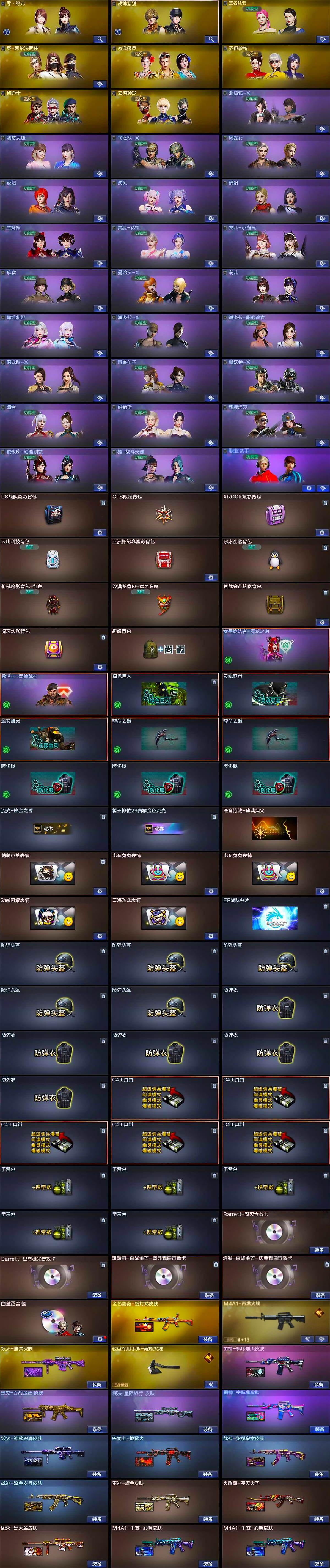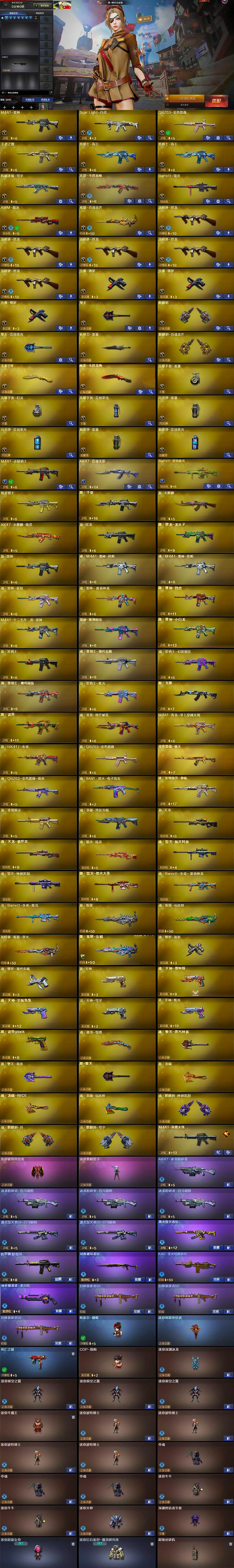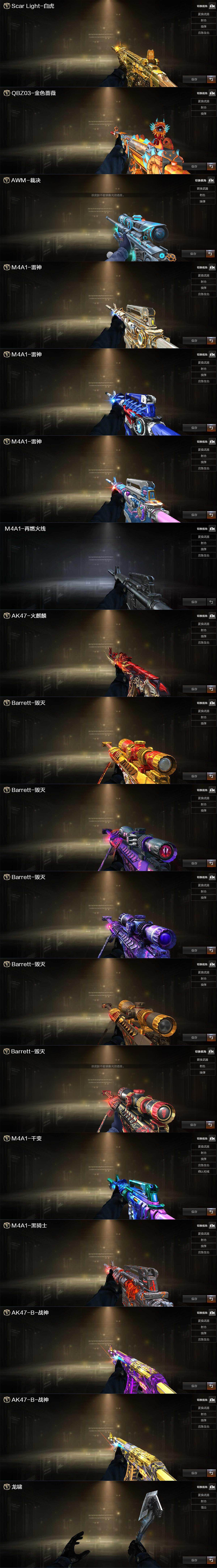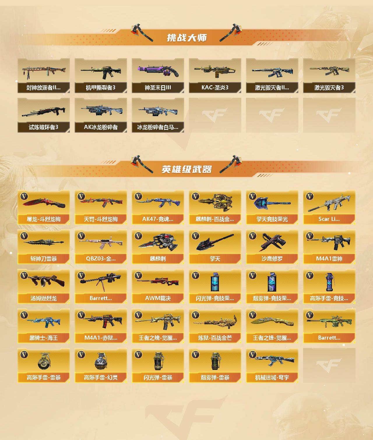 【英雄级武器】:M4A1-雷神,Scar Light-白虎,QBZ03-金色蔷薇,王者之魄-觉醒版,黑骑士-海王*2,机械迷城-穹宇,天罚-斗烈龙驹,Barrett-毁灭,AWM-裁决,炼狱-百战金芒,汤姆逊-烈龙*5,沙鹰-修罗*3,擎天,麒麟刺,擎天-竞技荣光,斩神刀-雷暴,麒麟刺-百战金芒,王者之锋-觉醒版,屠龙-斗烈龙驹,高爆手雷-雷暴,高爆手雷-幻灵,高爆手雷-竞技荣光,闪光弹-