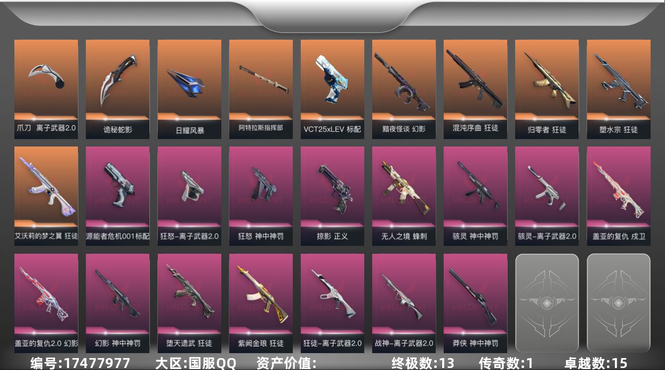 [17477977]【套装】:离子武器//2.0套装,神中神罚套装 【英雄】:幻棱,炼狱,维斯,暮蝶,钛狐,壹决,捷风,雷兹,不死鸟,贤者,猎枭,蝰蛇,零,芮娜,奇乐,斯凯,夜露,K/O,盖可,黑梦,钢锁 【近战武器】:近战武器-神之刃,近战武器-紫金爪刀,近战武器-落英飞旋,近战武器-离子武器//2.0 爪刀,近战武器-天御刀,近战武器-诡秘蛇影 军刀,近战武器-日耀风暴 遗器,近战武器-阿特拉斯指挥部 甩棍 【狂徒】:狂徒-艾沃莉的梦之翼,狂徒-归零者,狂徒-混沌序曲,狂徒-塑水宗,狂徒-堕天遗武,狂徒-紫阙金琅,狂徒-离子武器//2.0,狂徒-诡秘蛇影 【幻影】:幻影-黯夜怪谈,幻影-盖亚的复仇//2.0,幻影-神中神罚,幻影-末日之翼 【戍卫】:戍卫-盖亚的复仇,戍卫-折光棱晶 【獠犬】:獠犬-星航勇进 【冥驹】:冥驹-虎魄春明 【飞将】:飞将-末日之翼 【莽侠】:莽侠-神中神罚,莽侠-诡秘蛇影 【战神】:战神-离子武器//2.0 【奥丁】:奥丁-末日之翼 【判官】:判官-诡秘蛇影 【骇灵】:骇灵-离子武器//2.0,骇灵-神中神罚 【蜂刺】:蜂刺-无人之境,蜂刺-折光棱晶 【标配】:标配-源能者危机001,标配-折光棱晶 【VCT手枪】:标配-VCT25 x LEV 【正义】:正义-掠影 【鬼魅】:鬼魅-诡秘蛇影 【狂怒】:狂怒-离子武器//2.0,狂怒-神中神罚 【短炮】:短炮-末日之翼 【卡面】:热舞环节 卡面,树懒大作战 卡面,红鳞松叶 卡面,沙雕爆能器 卡面,无畏契约GO!第一卷:芮娜 卡面,无畏契约GO!第一卷:零 卡面,无垠星环 卡面,《双城之战》金克丝 卡面,钢锁vs盖可 卡面,代号红色 卡面,新兵报到 卡面,V契约 卡面,无畏契约 卡面 【喷漆】:审判之爪 喷漆,买装还是存钱 喷漆,关门放狗 喷漆,放下武器 喷漆,胜利属于无畏契约 喷漆,GLHF 喷漆,无畏契约 喷漆 【挂饰】:无畏契约GO!第一卷 芮娜 挂饰,薰衣草之心 挂饰,动力机箱 挂饰,招财猫熊 挂饰,天外飞客 挂饰,红鳞松叶 挂饰,《双城之战》魄罗 挂饰,盆栽小友 挂饰,无畏契约 纪念币 挂饰