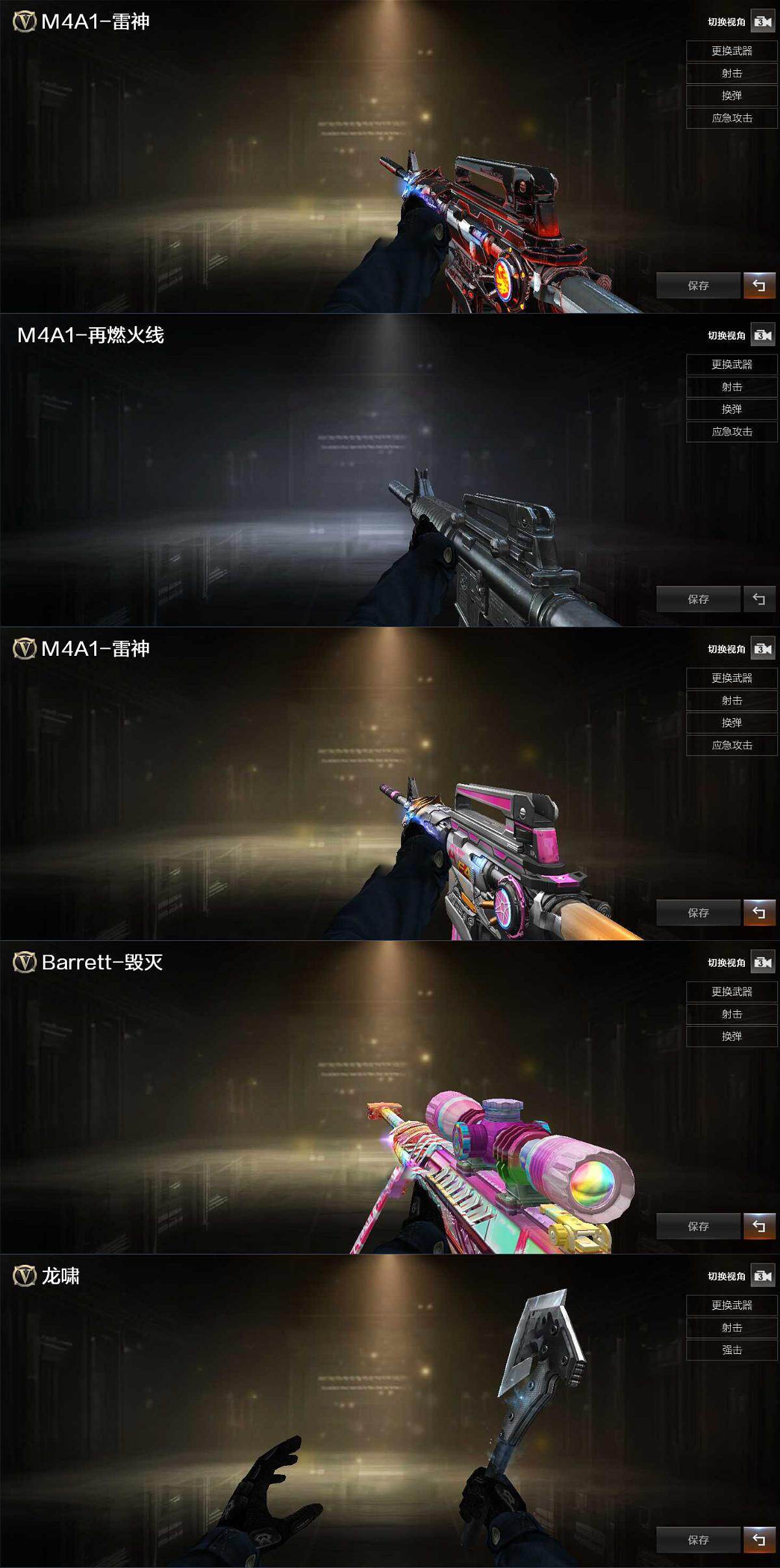 【皮肤】:雷神-暗月,M4A1-再燃火线,雷神-神秘按键 皮肤,毁灭-虹光风暴 皮肤,轻型军用手斧-再燃火线