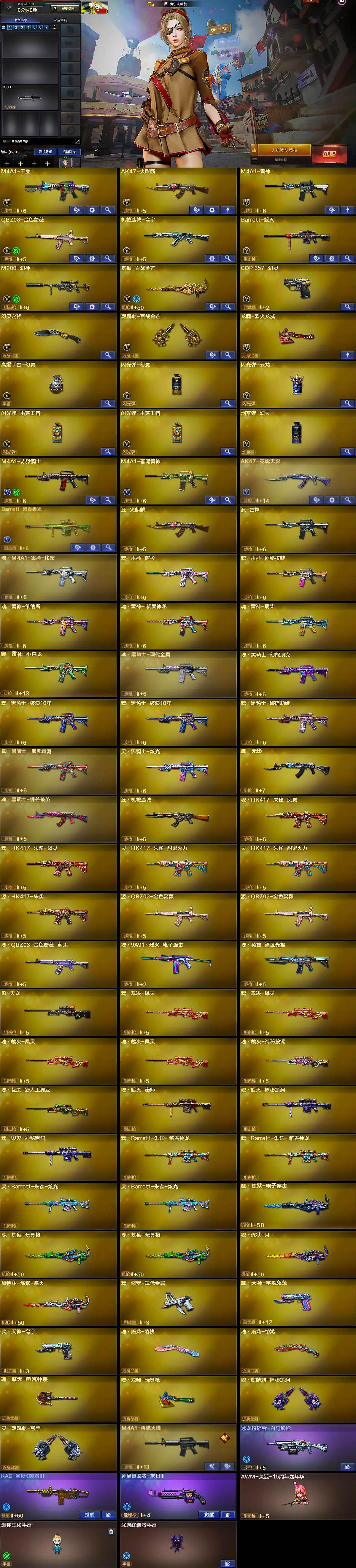 【源级武器】:源·火麒麟,御·火麒麟-平天大圣,源·雷神,魂·M4A1-雷神-化蛇,魂·雷神-诺拉,魂·雷神-神秘按键,魂·雷神-维纳斯,魂·雷神-新春神龙,魂·雷神-萌柴,御·雷神-机甲刑天,御·雷神-小白龙,魂·黑骑士-现代金属,魂·黑骑士-幻能朋克,魂·黑骑士-破浪10年*2,魂·黑骑士-娜塔莉娅,御·黑骑士·哪吒闹海,灵·黑骑士-炫光,源·无影,魂·黑武士-锋芒破茧,源·机械迷城,源·青龙,魂·HK417-朱雀-凤灵*2,灵·HK417-朱雀-甜蜜火力*2,源·HK417-朱雀,源-金色蔷薇*2,魂·QBZ03-金色蔷薇-萌杀,QBZ03-文殊坊,魂·9A91·烈火-电子连击,魂·英雄-湾区光枢,源·天龙,魂·裁决-凤灵*4,魂·裁决-神秘按键,魂·裁决-新人王绿豆,魂·裁决-羽掣,魂·毁灭-秦师,魂·毁灭-神秘黑洞*2,御·毁灭-黑大圣,魂·Barrett-朱雀-锦鲤,魂·Barrett-朱雀- 新春神龙*2,灵·Barrett-朱雀-炫光*2,魂·炼狱-电子连击,魂·炼狱-玩具枪*2,魂·炼狱-月,加特林-炼狱-