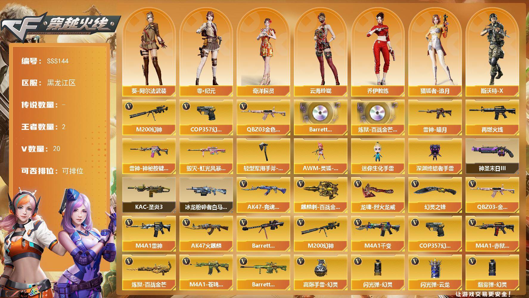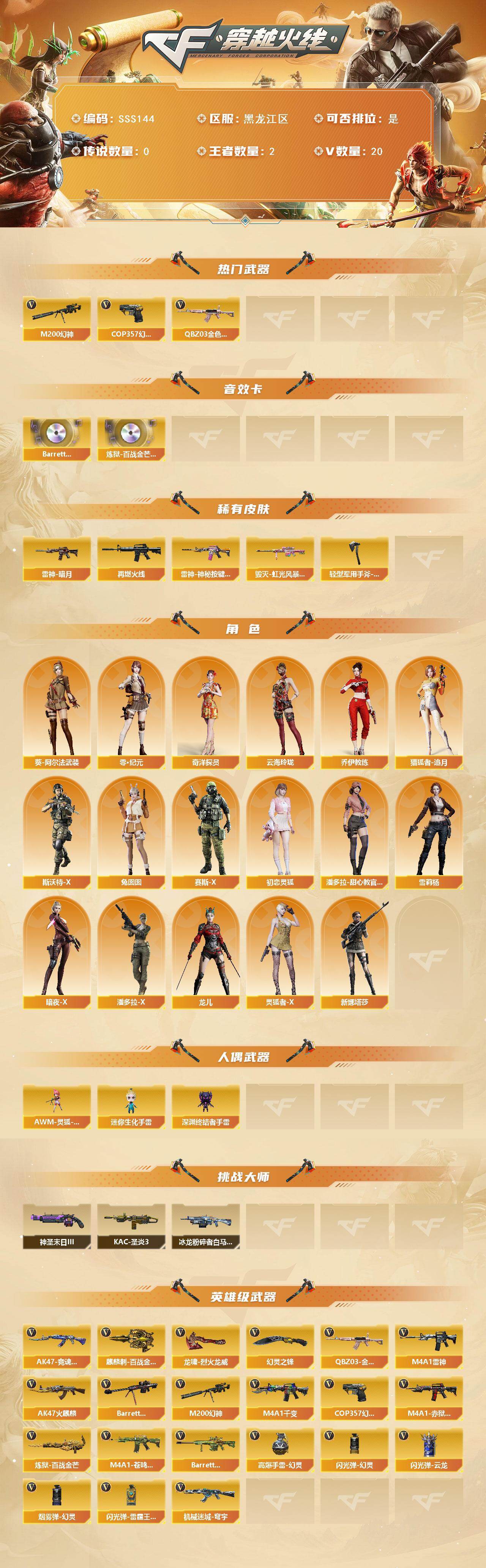 - [13036756]【376】127V/102级/荣耀元首/2传说/19王者/5炫金/7英雄/传说圣谕/传说星骇/QBZ03-金色蔷薇/Scar Light-白虎/HK417-朱雀/M200-幻神/柯尔特-荣耀世冠白鲨2023/M200-竞技荣光/八面凌龙/死亡之眼/火麒麟-荣耀世冠/雷神-荣耀世冠/白虎-电玩蓝兔/柯尔特-冠军之特/柯尔特-荣耀世冠/Kar98k-星神/金色小号/M4A1-黑骑士/汤姆逊-烈龙/RPK-盘龙/加特林-炼狱/火麒麟-绝迹/USP雷暴/沙鹰-修罗/金刚伞/王者之戮/王者之武/王者之怒/王者之击/炫金天神/炫金毁灭/炫金修罗/M200-幻神音效卡/AK47-火麒麟音效卡/M4A1-雷神音效卡/M4A1-黑骑士音效卡/Barrett-毁灭音效卡/AWM-裁决音效卡/星神音效卡/枪娘语音包-凯萨林/QBZ03-天罚音效卡/幻神周瑜/M200-幻神-荣耀世冠白鲨/幻神-荣耀世冠白鲨 2023/QBZ03冠军之薇/金色蔷薇-量子蔷薇/裁决-流光秘银/裁决-羽掣 皮肤/裁决-典雅胡桃 皮肤/裁决-运输船 皮肤/星神-枪娘默/Kar98K-星神-冠军之星皮肤/雷神-能量核心/雷神荣耀之魄/雷神-星空/雷神-荣耀世冠AG/雷神-机甲刑天皮肤/M4A1-再燃火线/火麒麟-冠军之心/火麒麟-华夏之心/火麒麟-平天大圣/火麒麟-荣耀世冠AG/火麒麟-心动糖果/毁灭-暗月/毁灭-荣耀之怒/毁灭耀金皮肤/毁灭-星空/毁灭-黑大圣皮肤/黑骑士-暗月/炼狱-星空/天龙-秘银/天龙-能量核心/AWM-天龙-传奇70KG/AWM-天龙-传奇白鲨/天神-暗月/屠龙-荣耀之锋/屠龙-荣耀世冠AG/屠龙-春桃/沙漠玫瑰/电竞教官-云悠悠/晴雅/雨墨/战地猎狐/玄豹/王者-瞳-闭月羞花/王者-魅影/灵狐者-职业经理/职业经理/铁骑荣耀/职业选手/M4A1-雷神-精英刀锋/AK47-斯沃特/AWM-灵狐-15周年嘉年华/迷你超能女侍/迷你深渊冰龙/迷你裂空之翼/闪光弹-貂蝉/斯泰尔-枪娘暗刃/超级对讲机/6烈龙/KAC-圣炎切割者/阐释者/M4A1-千变/AK47-火麒麟/M4A1-黑龙/M4A1-雷神/AK47-黑武士/AN94-超新星/M4A1-武圣/AK47-黑鲨/AK47-雷暴/M4A1-夜魔/QBZ03-天罚/无影-神兵利器/死神-雪域霜狐/M4A1-玫瑰精灵/AK-47-猩红传说/黑骑