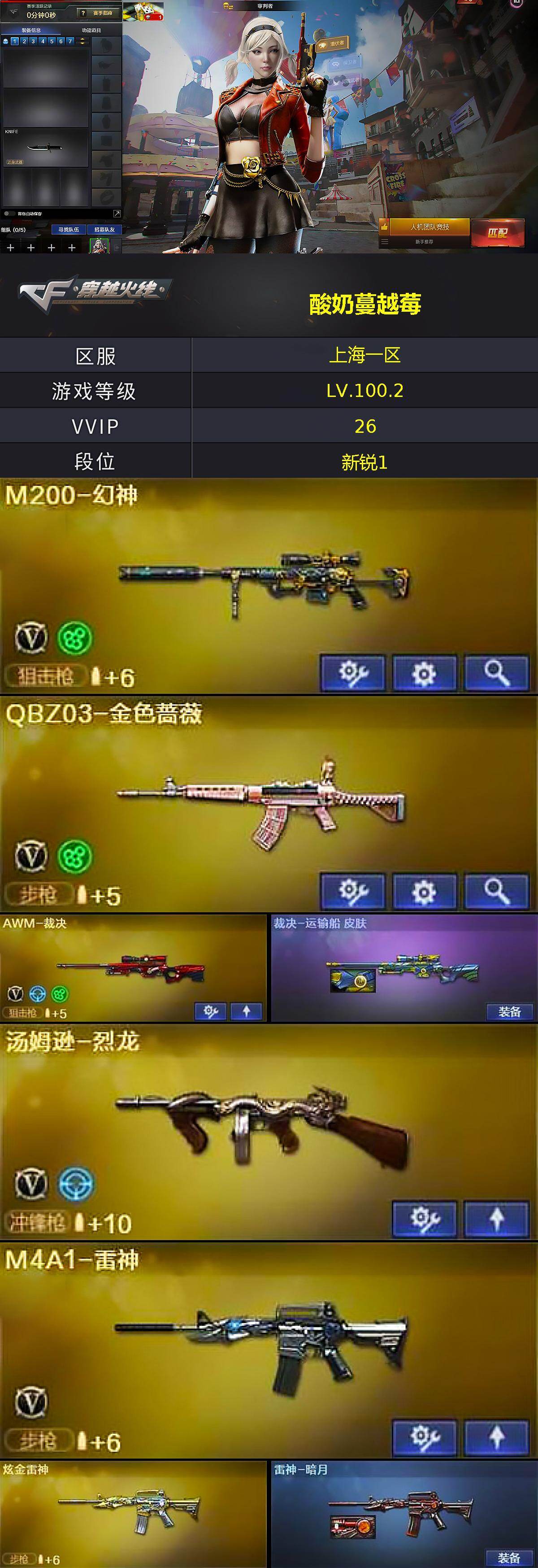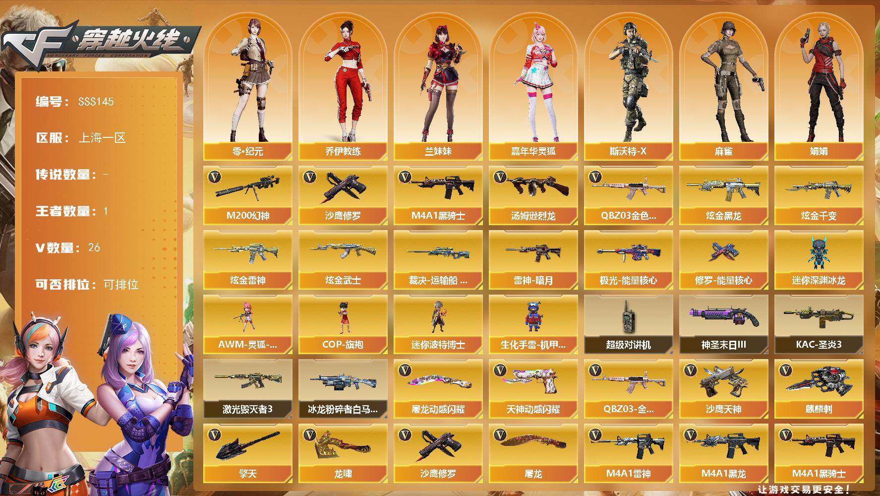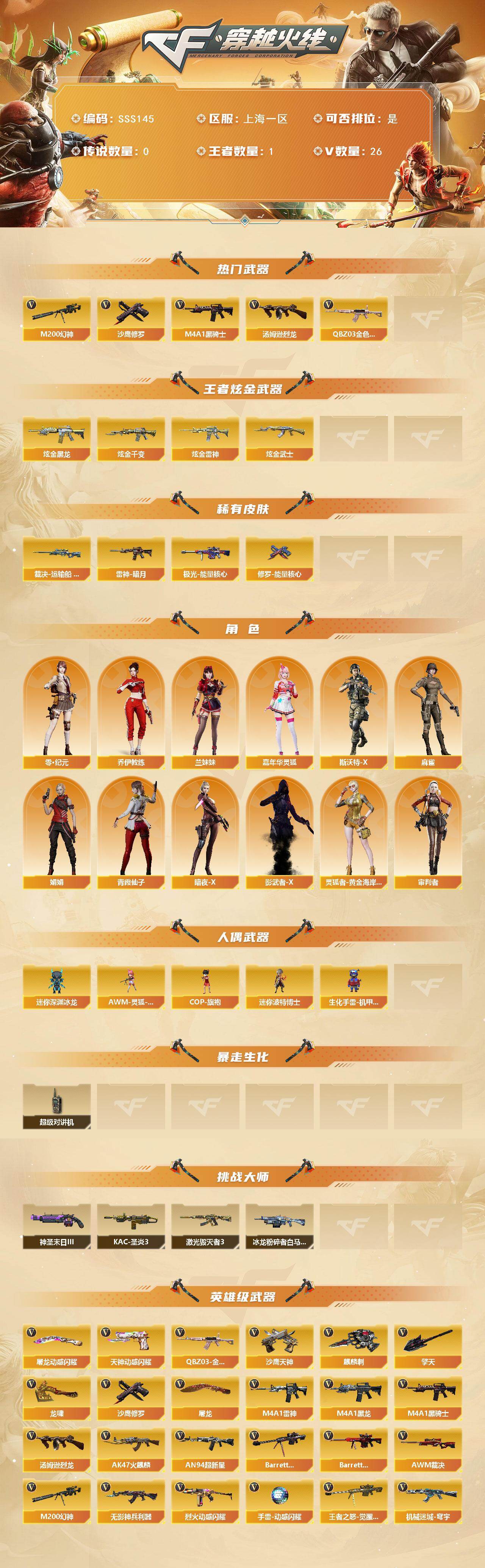 [17478114]上海一区-28V-1王者武器数-4炫金武器数 【热门武器】:QBZ03-金色蔷薇,M200-幻神,M4A1-黑骑士,汤姆逊-烈龙,沙鹰-修罗*2 【王者炫金武器】:炫金黑龙,炫金千变,炫金雷神,炫金武士 【皮肤】:裁决-运输船 皮肤,雷神-暗月,极光-能量核心,修罗-能量核心 【角色】:审判者,零·纪元,乔伊教练,暗夜-X,嘉年华灵狐,娟娟,兰妹妹,灵狐者-黄金海岸,麻雀,青霞仙子,斯沃特-X,影武者-X 【人偶武器】:AWM-灵狐-15周年嘉年华,COP-旗袍,迷你深渊冰龙,迷你波特博士,生化手雷-机甲核心 【暴走生化】:超级对讲机 【挑战大师】:冰龙粉碎者-白马银枪,激光毁灭者III,KAC-圣炎切割者III,神圣爆裂者-末日III 【英雄级武器】:AK47-火麒麟,M4A1-黑龙,M4A1-雷神,M4A1-黑骑士,AN94-超新星,无影-神兵利器,QBZ03-金色蔷薇,烈火-动感闪耀,机械迷城-穹宇,Barrett-毁灭,Barrett-极光,AWM-裁决,M200-幻神,王者之怒-觉醒版,汤姆逊-烈龙,沙鹰-修罗*2,沙鹰-天神,天神-动感闪耀,屠龙*2,龙啸,擎天,麒麟刺,屠龙-动感闪耀,手雷-动感闪耀 【源级武器】:源-千变,魂·雷神-诺拉,魂·雷神-神秘按键,魂·雷神-维纳斯,魂·雷神-15周年嘉年华,雷神-赛博朋克*2,源·黑骑士,魂·黑骑士-现代金属,御·黑骑士-冰魄,源·机械迷城,魂·HK417-朱雀-凤灵*2,金色蔷薇-狼王,魂·英雄-湾区光枢,魂·毁灭-青帝,魂·Barrett-朱雀-锦鲤,灵·Barrett-朱雀-炫光,魂·炼狱-电子连击,魂·炼狱-月,魂·修罗-15周年嘉年华,魂·修罗-迷彩,源·天神,灵·天神-穹宇,魂·屠龙-都是Cfer,魂·屠龙-惊鸿,源·龙啸,魂·麒麟刺-月,灵·麒麟刺-穹宇 【道具】:云山科技背包,全能枪王背包,女皇终结者-背包,炫彩背包,超级背包,女皇终结者-魔龙之吻,救世主-黑桃战神,绿色巨人,灵魂忍者,迷雾幽灵,生化弹匣,夺命之镰,防化服*3,金色流光-枪王排位,流光-鎏金之域,炽雪表情,动感闪耀表情,防弹头盔*6,防弹衣*4,C4工具钳*5,手雷包*4 【特殊枪械】:1黑骑士,1烈龙