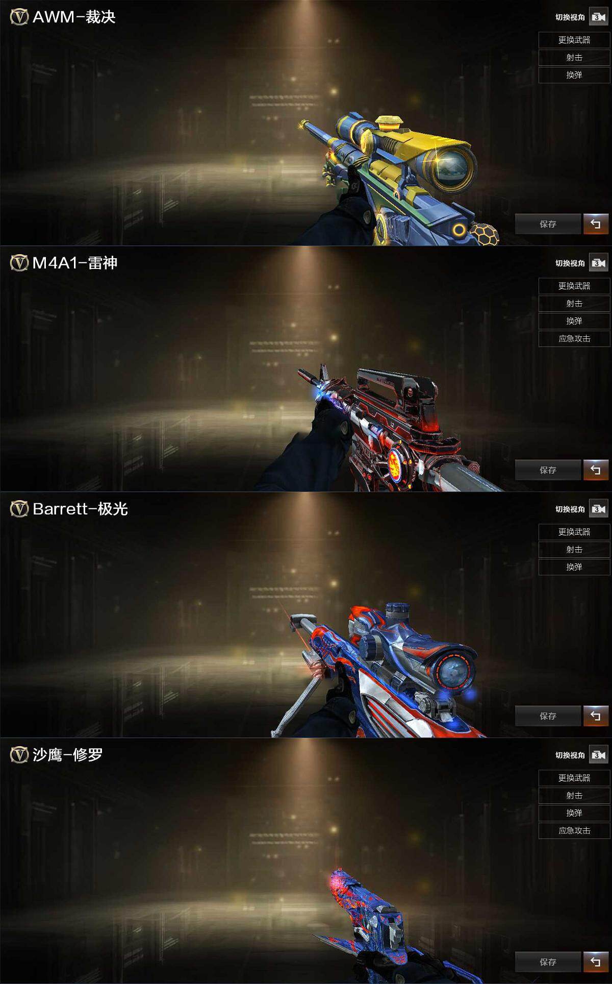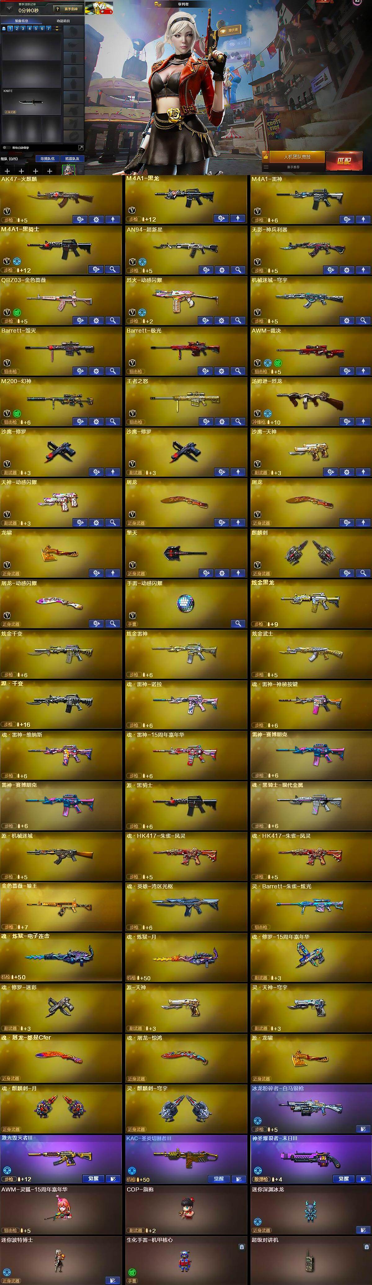 【英雄级武器】:AK47-火麒麟,M4A1-黑龙,M4A1-雷神,M4A1-黑骑士,AN94-超新星,无影-神兵利器,QBZ03-金色蔷薇,烈火-动感闪耀,机械迷城-穹宇,Barrett-毁灭,Barrett-极光,AWM-裁决,M200-幻神,王者之怒-觉醒版,汤姆逊-烈龙,沙鹰-修罗*2,沙鹰-天神,天神-动感闪耀,屠龙*2,龙啸,擎天,麒麟刺,屠龙-动感闪耀,手雷-动感闪耀