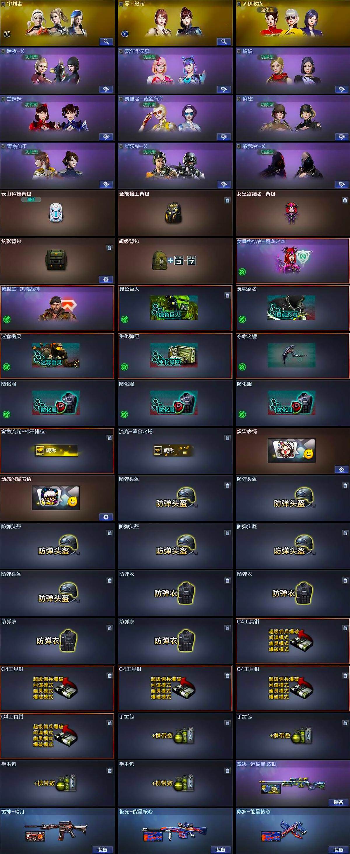【道具】:云山科技背包,全能枪王背包,女皇终结者-背包,炫彩背包,超级背包,女皇终结者-魔龙之吻,救世主-黑桃战神,绿色巨人,灵魂忍者,迷雾幽灵,生化弹匣,夺命之镰,防化服*3,金色流光-枪王排位,流光-鎏金之域,炽雪表情,动感闪耀表情,防弹头盔*6,防弹衣*4,C4工具钳*5,手雷包*4