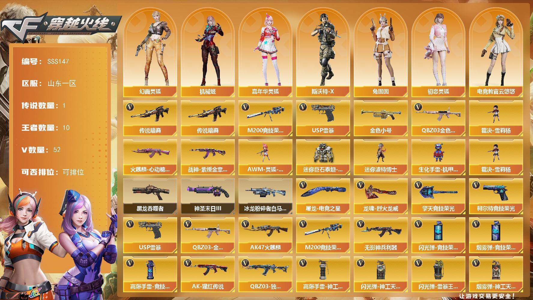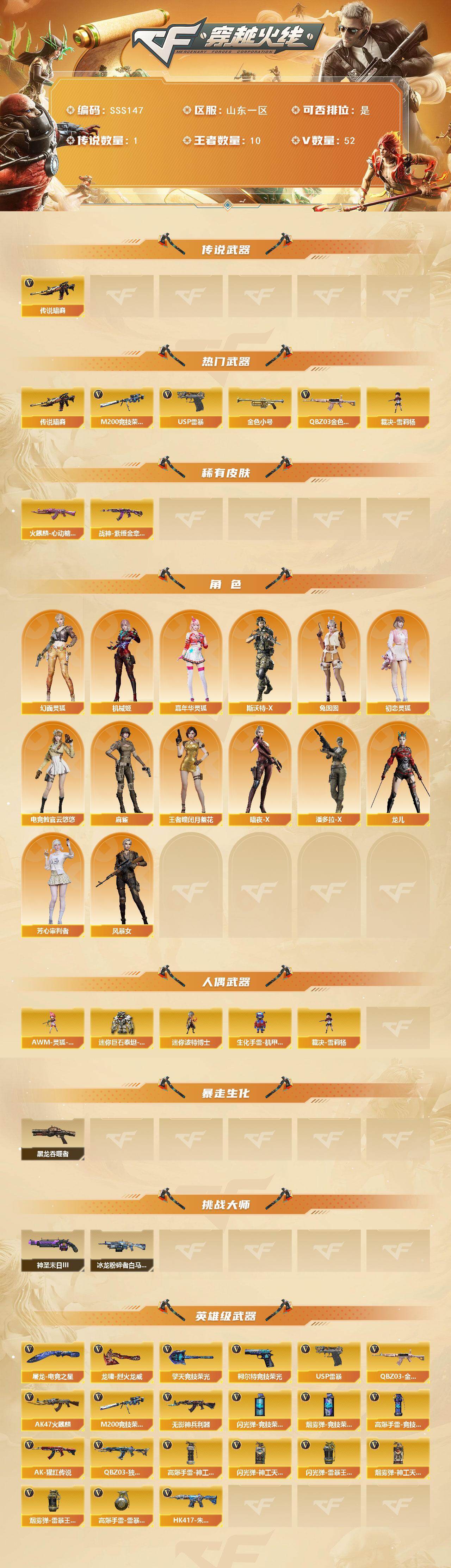 [17478333]山东一区-52V-10王者武器数-0炫金武器数 【传说武器】:传说暗裔 【热门武器】:传说暗裔,QBZ03-金色蔷薇,M200-竞技荣光,金色小号,裁决-雪莉杨,USP-雷暴 【皮肤】:火麒麟-心动糖果,战神-紫绶金章皮肤 【角色】:电竞教官-云悠悠,机械姬,王者-瞳-闭月羞花,幻面灵狐,暗夜-X,初恋灵狐,芳心审判者,风暴女*2,嘉年华灵狐,龙儿,麻雀,潘多拉-X,斯沃特-X,兔囡囡 【人偶武器】:裁决-雪莉杨,AWM-灵狐-15周年嘉年华,迷你波特博士,生化手雷-机甲核心*2,迷你巨石泰坦-魔花研究所 【暴走生化】:黑龙吞噬者 【挑战大师】:冰龙粉碎者-白马银枪,神圣爆裂者-末日III 【英雄级武器】:AK47-火麒麟,无影-神兵利器,QBZ03-独角-III,QBZ03-金色蔷薇,AK-47-猩红传说,HK417-朱雀-电竞之星,M200-竞技荣光,USP-雷暴,柯尔特-竞技荣光,擎天-竞技荣光,屠龙-电竞之星,龙啸-烈火龙威,高爆手雷-竞技荣光*11,高爆手雷-神工天巧,高爆手雷-雷暴王者*3,闪光弹-竞技荣光*7,闪光弹-神工天巧,闪光弹-雷暴王者*3,烟雾弹-竞技荣光*9,烟雾弹-神工天巧*3,烟雾弹-雷暴王者*3 【源级武器】:源·火麒麟*2,魂·火麒麟-百城,源·雷神*2,魂·雷神-新春神龙,魂-雷神-萌杀,魂·雷神-15周年嘉年华,御·雷神-机甲刑天*2,御·雷神-烈虎*3,M4A1-十二生肖·龙-雷神,雷神-赛博幻想,魂·黑骑士-摸金校尉,魂·黑骑士-现代金属*2,魂·黑骑士-幻能朋克*2,魂·黑骑士-破浪10年*2,御·黑骑士-冰魄,魂-死神-机甲核心,源·AK47-黑武士,源·武圣*3,源·机械迷城,魂·龙血-锋芒破茧*2,源·HK417-朱雀,源-金色蔷薇,魂·QBZ03-金色蔷薇-萌杀,源·猎神,源-极光,源·天龙,AWM-裁决-百城联赛天津,源·毁灭*2,魂·毁灭-青帝*2,魂·毁灭-神秘黑洞,源·Barrett-朱雀,魂·炼狱-玩具枪,魂·炼狱-月,加特林-炼狱-掌火,御·炼狱-女娲,魂·修罗-15周年嘉年华,魂·修罗-现代金属,魂·天神-宇航兔兔,源·武圣glock,魂·屠龙-都是Cfer,源·擎天-萌杀*2,源·龙啸,魂·龙啸-秦师*2 【道具】:全能枪王背包,虎牙炫彩背包,超级背包,绿色巨人,灵魂忍者,迷雾幽灵,夺命之镰,防化