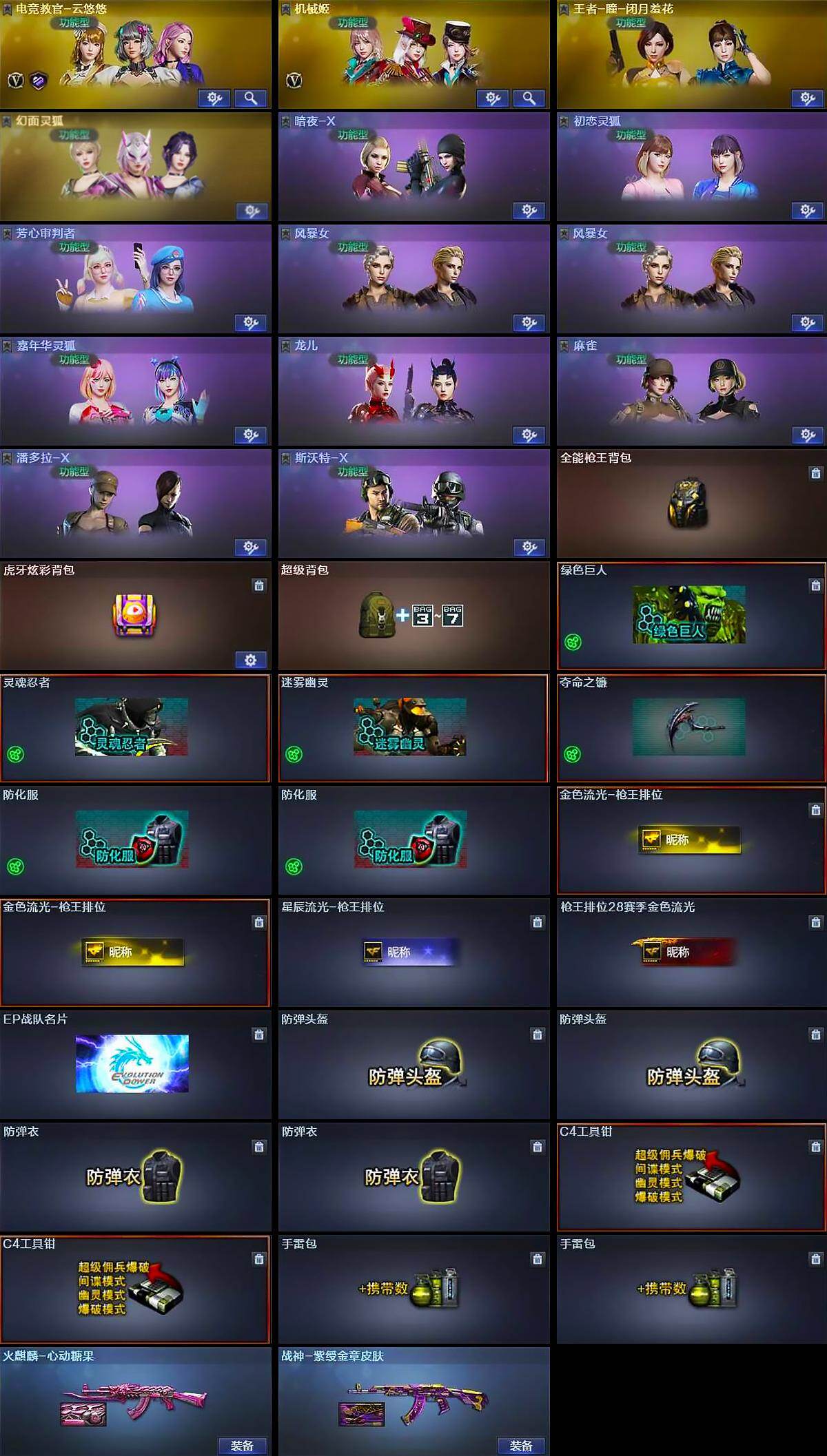【道具】:全能枪王背包,虎牙炫彩背包,超级背包,绿色巨人,灵魂忍者,迷雾幽灵,夺命之镰,防化