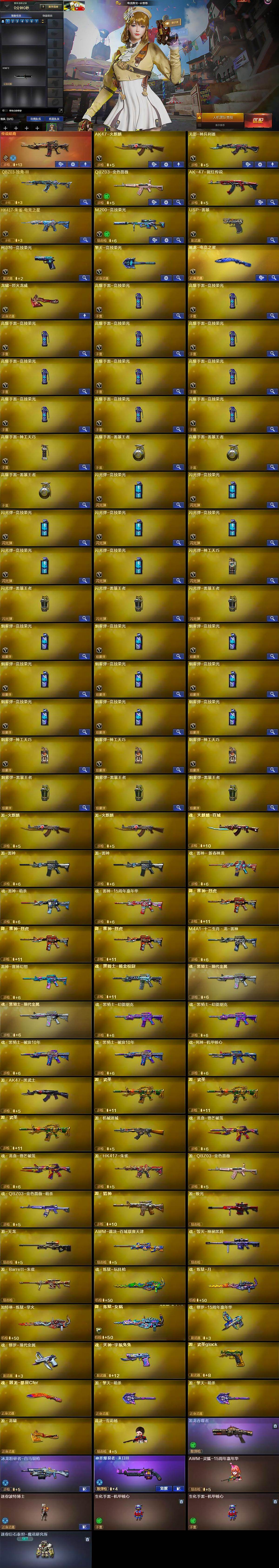 【源级武器】:源·火麒麟*2,魂·火麒麟-百城,源·雷神*2,魂·雷神-新春神龙,魂-雷神-萌杀,魂·雷神-15周年嘉年华,御·雷神-机甲刑天*2,御·雷神-烈虎*3,M4A1-十二生肖·龙-雷神,雷神-赛博幻想,魂·黑骑士-摸金校尉,魂·黑骑士-现代金属*2,魂·黑骑士-幻能朋克*2,魂·黑骑士-破浪10年*2,御·黑骑士-冰魄,魂-死神-机甲核心,源·AK47-黑武士,源·武圣*3,源·机械迷城,魂·龙血-锋芒破茧*2,源·HK417-朱雀,源-金色蔷薇,魂·QBZ03-金色蔷薇-萌杀,源·猎神,源-极光,源·天龙,AWM-裁决-百城联赛天津,源·毁灭*2,魂·毁灭-青帝*2,魂·毁灭-神秘黑洞,源·Barrett-朱雀,魂·炼狱-玩具枪,魂·炼狱-月,加特林-炼狱-掌火,御·炼狱-女娲,魂·修罗-15周年嘉年华,魂·修罗-现代金属,魂·天神-宇航兔兔,源·武圣glock,魂·屠龙-都是Cfer,源·擎天-萌杀*2,源·龙啸,魂·龙啸-秦师*2