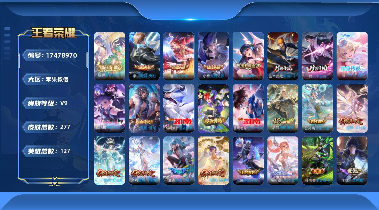 [17478970]微社交限制不影响游戏 介意勿拍!苹果WX-V9-尊贵铂金II段位-127英雄-277皮肤-3典藏皮肤-1珍品无双-1无双-8珍品传说-28传说-87史诗-3天幕