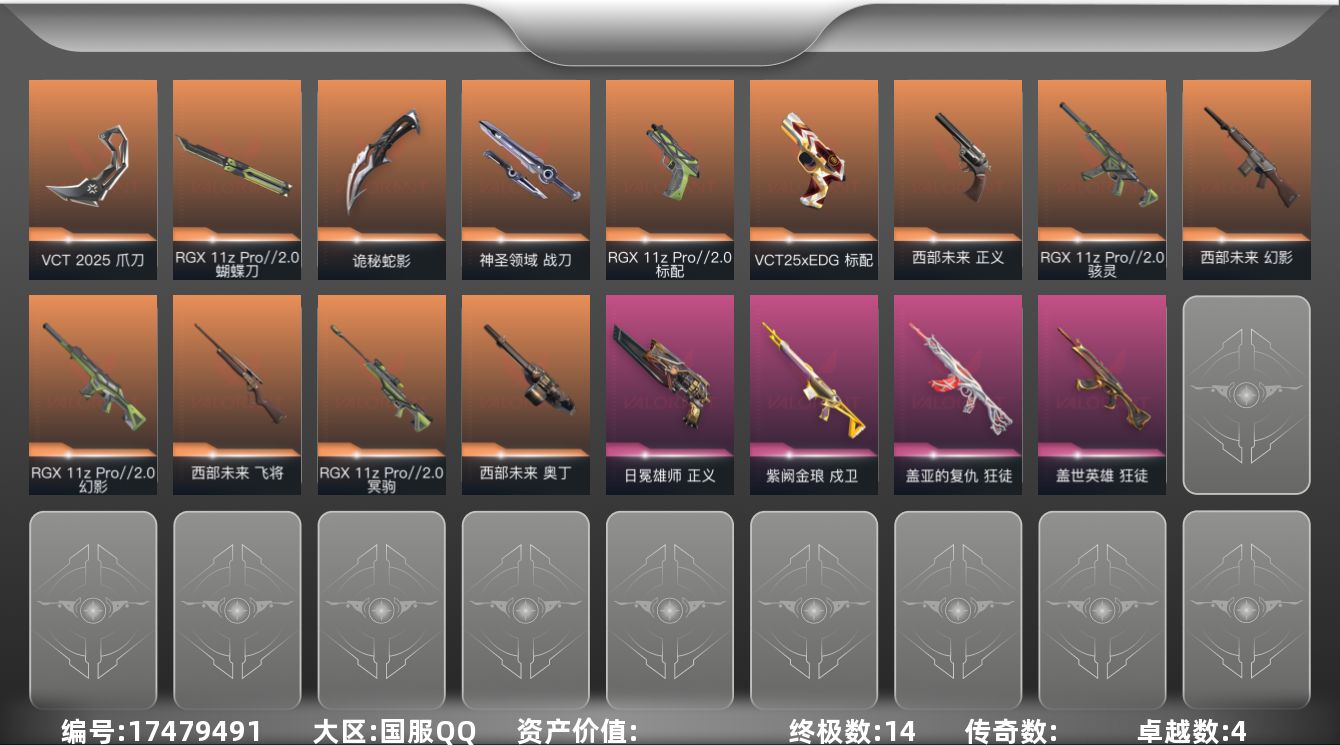 [17479491]【英雄】:幻棱,炼狱,暮蝶,钛狐,壹决,铁臂,捷风,雷兹,幽影,不死鸟,贤者,猎枭,蝰蛇,芮娜,尚勃勒,星礈,盖可,钢锁 【近战武器】:近战武器-RGX 11z Pro//2.0 蝴蝶刀,近战武器-VCT 2025 爪刀,近战武器-未来开拓者,近战武器-诡秘蛇影 军刀,近战武器-神圣领域 战刀 【狂徒】:狂徒-盖世英雄,狂徒-盖亚的复仇,狂徒-诡秘蛇影 【幻影】:幻影-RGX 11z Pro//2.0,幻影-西部未来,幻影-神圣领域,幻影-末日之翼,幻影-西部未来 【戍卫】:戍卫-紫阙金琅,戍卫-月球哨兵,戍卫-折光棱晶 【獠犬】:獠犬-神圣领域 【冥驹】:冥驹-RGX 11z Pro//2.0,冥驹-星云暗涌 【飞将】:飞将-西部未来,飞将-末日之翼 【莽侠】:莽侠-诡秘蛇影,莽侠-月球哨兵 【战神】:战神-神圣领域 【奥丁】:奥丁-西部未来,奥丁-末日之翼 【判官】:判官-诡秘蛇影 【雄鹿】:雄鹿-月球哨兵 【骇灵】:骇灵-RGX 11z Pro//2.0,骇灵-星云暗涌 【蜂刺】:蜂刺-星云暗涌,蜂刺-折光棱晶 【标配】:标配-RGX 11z Pro//2.0,标配-折光棱晶 【VCT手枪】:标配-VCT25 x EDG 【正义】:正义-西部未来,正义-日冕雄师,正义-月球哨兵 【鬼魅】:鬼魅-诡秘蛇影,鬼魅-星云暗涌 【狂怒】:狂怒-神圣领域 【短炮】:短炮-末日之翼 【卡面】:时间到 卡面,最高舞台 卡面,梦幻奶茶 卡面,无畏契约GO!第一卷:芮娜 卡面,清除名单 卡面,无畏契约GO!第一卷:零 卡面,代号红色 卡面,冰淇淋店 卡面,新兵报到 卡面,友军火力 卡面,V契约 卡面,无畏契约 卡面