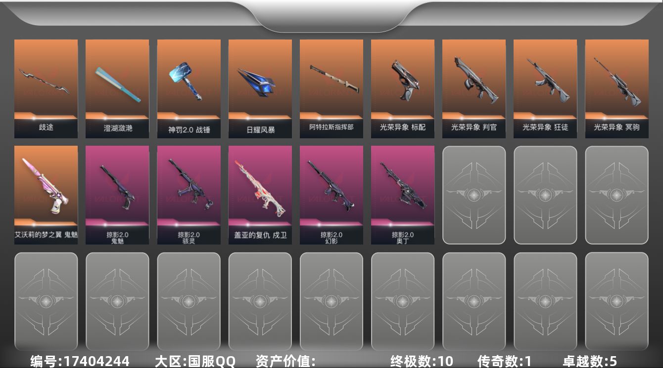 [17404244]【套装】:光荣异象套装,掠影//2.0套装 【英雄】:炼狱,暮蝶,钛狐,壹决,铁臂,捷风,雷兹,不死鸟,贤者,猎枭,芮娜,奇乐,尚勃勒,霓虹,斯凯,夜露,K/O,海神,盖可,黑梦,钢锁 【近战 武器】:近战武器-影钩,近战武器-光荣异象 歧途,近战武器-澄湖潋滟,近战武器-神罚//2.0 战锤,近战武器-日耀风暴 遗器,近战武器-阿特拉斯指挥部 甩棍 【狂徒】:狂徒-光荣异象 【幻影】:幻影-掠影//2.0 【戍卫】:戍卫-盖亚的复仇 【冥驹】:冥驹-光荣异象 【奥丁】:奥丁-掠影//2.0 【判官】:判官-光荣异象 【骇灵】:骇灵-掠影//2.0 【标配】:标配-光荣异象 【鬼魅】:鬼魅-艾沃莉的梦之翼,鬼魅-掠影//2.0,鬼魅-诡秘蛇影 【卡面】:树懒大作战 卡面,无畏契约GO!第一卷:芮娜 卡面,无畏契约GO!第一卷:零 卡面,无垠星环 卡面,《双城之战》金克丝 卡面,代号红色 卡面,新兵报到 卡面,V契约 卡面,无畏契约 卡面 【喷漆】:买装还是存钱 喷漆,放下武器 喷漆,胜利属于无畏契约 喷漆,GLHF 喷漆,无畏契约 喷漆 【挂饰】:动力机箱 挂饰,天外飞客 挂饰,无畏契约 纪念币 挂饰