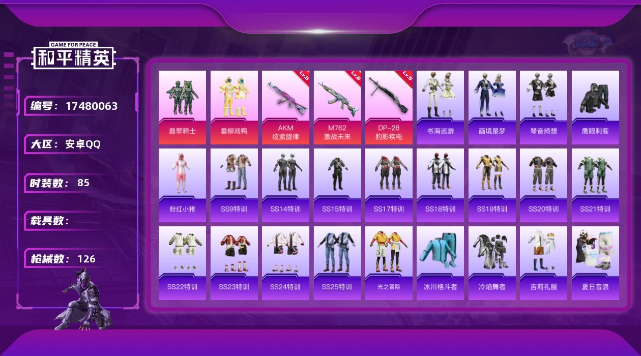 [17480063]安卓 手Q-2粉装-4特效枪-0载具-1粉色飞行器-37666热力值-8王牌印记-85套装-126枪皮 【热门品类】:套装-粉红小猪 【粉色套装】:粉装-翡翠骑士,粉装-垂柳戏鸭 【粉色枪皮等级】:AKM-炫紫旋律(六级),M762-激战未来(六级),AKS-74U-森灵之息(五级),DP-28-豹影疾电(五级) 【粉色枪皮】:AKM-炫紫旋律,M762-激战未来,AKS-74U-森灵之息,DP-28-豹影疾电 【粉色飞行器】:激战未来飞行器 【粉色降落伞】:炫紫旋律降落伞,星之彼岸降落伞,垂柳戏鸭降落伞,暗夜鎏金降落伞,炫光之旅降落伞 【稀有套装】:套装-书海巡游,套装-画境星梦,套装-琴音绮想 【稀有枪皮】:AKM-夜灯,AKM-奇异狩猎者,AKM-星之彼岸,AKM-龙的传人,M16A4-夜灯,M16A4-幻世战舞者,M16A4-甜心亚梦,SCAR-L-炫彩节奏,SCAR-L-玉兔迎春,SCAR-L-红色方程式,M416-夜灯,M416-梨园星光,M416-神秘黑猫,M416-糯团青竹,M416-绯红前夜,M416-蓝色火焰,GROZA-彩虹符号,GROZA-影袭,GROZA-治愈之星,GROZA-田园牧歌,AUG-青春冒险家,QBZ-赛罗,M762-天降萌叽,M762-绯红前夜,Mk47-妙红点点,Mk47-青春冒险家,G36C-炙焰牛王,AC-VAL-天降萌叽,AC-VAL-彩虹甜喵,AC-VAL-甜心亚梦,蜜獾-娇憨猪猪,ACE32-画境星梦,UZI-众神之王,UZI-娇憨猪猪,UZI-金风玉露,UMP45-夜灯,UMP45-蓝色火焰,Vector-彩虹符号,Vector-治愈之星,Vector-田园牧歌,Vector-香水柠檬,汤姆逊-天降萌叽,汤姆逊-耀粉歌者,野牛-王牌四分卫,野牛-青春冒险家,MP5K-众神之王,MP5K-梨园星光,MP5K-画境星梦,P90-筑梦精灵,Kar98K-彩虹符号,Kar98K-炫彩节奏,M24-影袭,M24-治愈之星,M24-炫彩节奏,M24-众神之王,AWM-垂柳戏鸭,AWM-王牌四分卫,SKS-炫彩节奏,SKS-糯团青竹,VSS-星之彼岸,VSS-田园牧歌,Mini14-穿刺龙虾,Mini14-金鼠迎春,Mk14-治愈之星,SLR-众神之王,SLR-娇憨猪猪,SLR-彩虹符号,QBU-青春冒险家,AMR-妙红点点