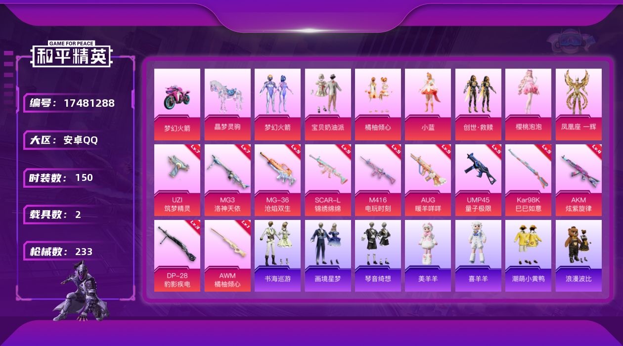 - [16363789]【店主推荐捡漏号!可直接换绑】安卓 手Q-6粉装-6特效枪-0载具-4粉色飞行器-54725热力值-12王牌印记-153套装-186枪皮【热门品类】:套装-浪漫天命,套装-星河浪客,套装-龟仙人,套装-暗影哥特【粉色套装】:粉装-星之彼岸,角色-2号机款机体服,粉装-憨憨奶龙,玩偶服-猪猪侠,角色-千金淑猫,角色-灵玺【粉色枪皮等级】:AKM-绿萝繁花(五级),SCAR-L-锦绣绵绵(五级),GROZA-镜光银凌(五级),Kar98K-巳巳如意(五级),M249-绝对恒星(七级),DP-28-豹影疾电(五级)【粉色枪皮】:AKM-绿萝繁花,SCAR-L-锦绣绵绵,GROZA-镜光银凌,Kar98K-巳巳如意,M249-绝对恒星,DP-28-豹影疾电【粉色飞行器】:绝对恒星飞行器,拂晓神骑飞行器,夜幕颂歌飞行器