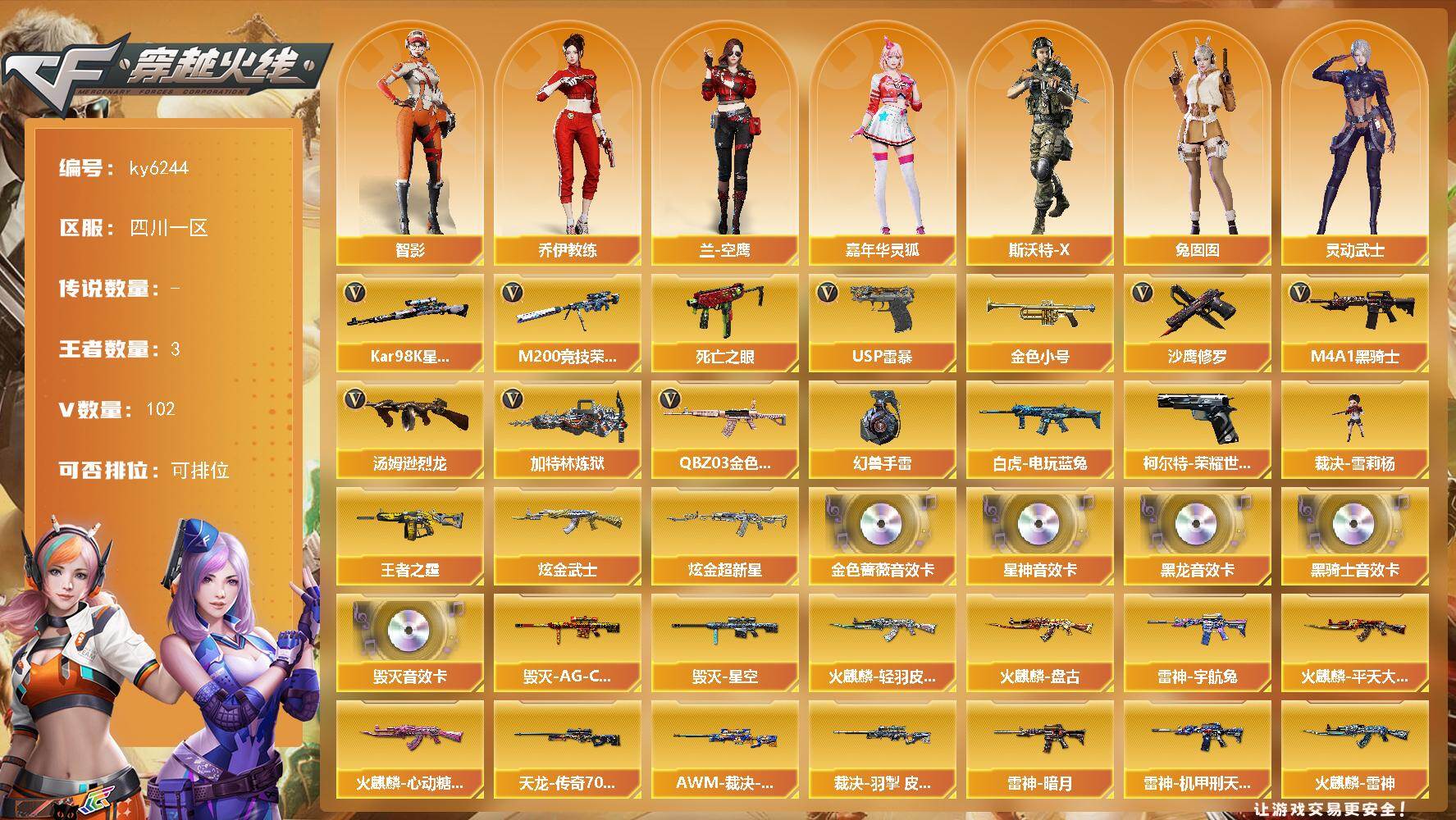 [17481372]【ky6244】四川一区-104V-3王者武器数-2炫金武器数 【热门武器】:QBZ03-金色蔷薇,柯尔特-荣耀世冠白鲨2023,M200-竞技荣光,死亡之眼,白虎-电玩蓝兔,Kar98K-星神,金色小号,M4A1-黑骑士*2,汤姆逊-烈龙,加特林-炼狱,裁决-雪莉杨,USP-雷暴,沙鹰-修罗,高爆手雷-幻兽 【王者炫金武器】:王者之霆,炫金武士,炫金超新星 【音效卡】:M4A1-黑龙音效卡,M4A1-黑骑士音效卡,Barrett-毁灭音效卡,QBZ03-金色蔷薇音效卡,Kar98K-星神音效卡 【皮肤】:AWM-裁决-百城联赛天津皮肤,裁决-羽掣 皮肤,雷神-暗月,雷神-机甲刑天皮肤,雷神-宇航兔皮肤,火麒麟-雷神,火麒麟-轻羽皮肤,火麒麟-平天大圣,火麒麟-盘古,火麒麟-心动糖果,毁灭-星空,毁灭-AG-CFPLS15冠军,毁灭-航天科技皮肤,黑龙-能量核心,玫瑰精灵-蓝调梦幻 皮肤,战神-粉色甜心皮肤*2,战神-紫绶金章皮肤*2,战神-流金岁月皮肤*2,AWM-天龙-传奇70KG,修罗-能量核心 【角色】:葵,魅影,炫,电竞教官-云悠悠,王者-瞳-闭月羞花,乔伊教练,暗夜-X,初恋灵狐,芳心审判者,风暴女,嘉年华灵狐,兰-空鹰,兰-新年限定,灵动武士,灵狐者-X,灵狐者-黄金海岸,龙儿,龙儿-小淘气,潘多拉-X,潘多拉-甜心教官,潜龙队-X,青霞仙子,斯沃特-X,蜀雪,铁骑荣耀,兔囡囡,新娜塔莎,樱-战斗天使,影武者-X,智影 【人偶武器】:裁决-雪莉杨,火麒麟-灵狐,迷你宝贝,AK47-红水晶-斯沃特精英,AWM-灵狐-15周年嘉年华,M37-葵,迷你深渊冰龙,夺魂,迷你牛牛,闪光弹-小乔,迷你超能女侍 【暴走生化】:黑龙吞噬者,死亡之眼,超级对讲机 【挑战大师】:神圣爆裂者III,AK47-冰龙粉碎者,激光毁灭者III-白马银枪 【英雄级武器】:AK47-火麒麟*3,M4A1-黑龙,M4A1-雷神,M4A1-黑骑士*2,AK47-机械迷城,AK47-黑鲨*2,M4A1-龙血,M4A1-雷霆,无影-神兵利器,M4A1-玫瑰精灵,QBZ03-金色蔷薇,烈火-动感闪耀,王者之圣-觉醒版,AK-47-猩红传说,AK47-B-战神,白虎-电玩蓝兔,Barrett-毁灭,AWM-裁决,Kar98K-星神,M200-竞技荣光,加特林-炼狱,汤姆逊-烈龙,王者之霆-觉醒