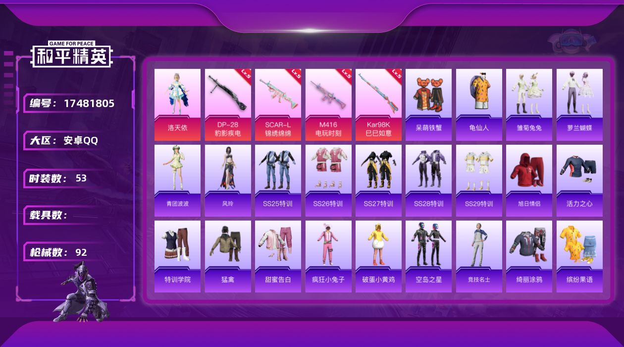 [17481805]安卓 手Q-1粉装-4特效枪-0载具-0粉色飞行器-22596热力值-7王牌印记-53套装-92枪皮 【热门品类】:套装-龟仙人 【粉色套装】:角色-洛天依 【粉色枪皮等级】:SCAR-L-锦绣绵绵(五级),M416-电玩时刻(五级),Kar98K-巳巳如意(五级),DP-28-豹影疾电(五级) 【粉色枪皮】:SCAR-L-锦绣绵绵,M416-电玩时刻,Kar98K-巳巳如意,DP-28-豹影疾电 【粉色降落伞】:恐龙拽拽降落伞 【稀有套装】:套装-龟仙人,套装-雏菊兔兔,套装-萝兰蝴蝶,套装-青团波波,角色-风玲 【稀有枪皮】:AKM-影袭,AKM-霓虹街区,AKM-龙的传人,M16A4-幻世战舞者,SCAR-L-炫彩节奏,SCAR-L-玉兔迎春,SCAR-L-红色方程式,M416-糯团青竹,M416-蓝色火焰,GROZA-影袭,GROZA-恐龙拽拽,AUG-天降萌叽,AUG-耀粉歌者,QBZ-洛神天依,M762-天降萌叽,M762-彩虹符号,Mk47-洛神天依,AC-VAL-快闪甜心,蜜獾-天降萌叽,UZI-啾咪啾咪,UZI-天降萌叽,UZI-炫彩节奏,UMP45-繁龙极客,UMP45-仲夏莫吉托,UMP45-生命誓言,Vector-焰鹰斗篷,Vector-生命誓言,汤姆逊-天降萌叽,P90-快闪甜心,P90-巳巳如意,Kar98K-彩虹符号,AWM-焰鹰斗篷,AWM-恐龙拽拽,SKS-炫彩节奏,Mini14-春暖花开,Mini14-炫彩节奏,Mini14-耀粉歌者,AMR-鬼刀,MK20-H-快闪甜心,S686-蜜语绒猫,S686-彩虹符号,DBS-焰鹰斗篷,M249-彩虹符号,DP-28-焰鹰斗篷,DP-28-彩虹符号,MG3-幻世战舞者,短管霰弹-星穹咏叹调,沙漠之鹰-快闪甜心 【其他套装】:套装-SS25特训,套装-SS26特训,套装-SS27特训,套装-SS28特训,套装-SS29特训,套装-旭日情侣,套装-活力之心,套装-特训学院,套装-猛禽,套装-甜蜜告白,套装-疯狂小兔子,套装-破蛋小黄鸡,套装-空岛之星,套装-竞技名士,套装-绮丽涂鸦,套装-缤纷果语,套装-耀粉歌者,套装-都市魅力,套装-长空猛禽,套装-霓虹街区,套装-青玉碎影,套装-魅力单车,套装-黑色伏地魔,套装-龙的传人,套装-龟仙人,套装-冰冻风暴,套装-呆萌铁蟹,套装-豚鼠丹丹,套