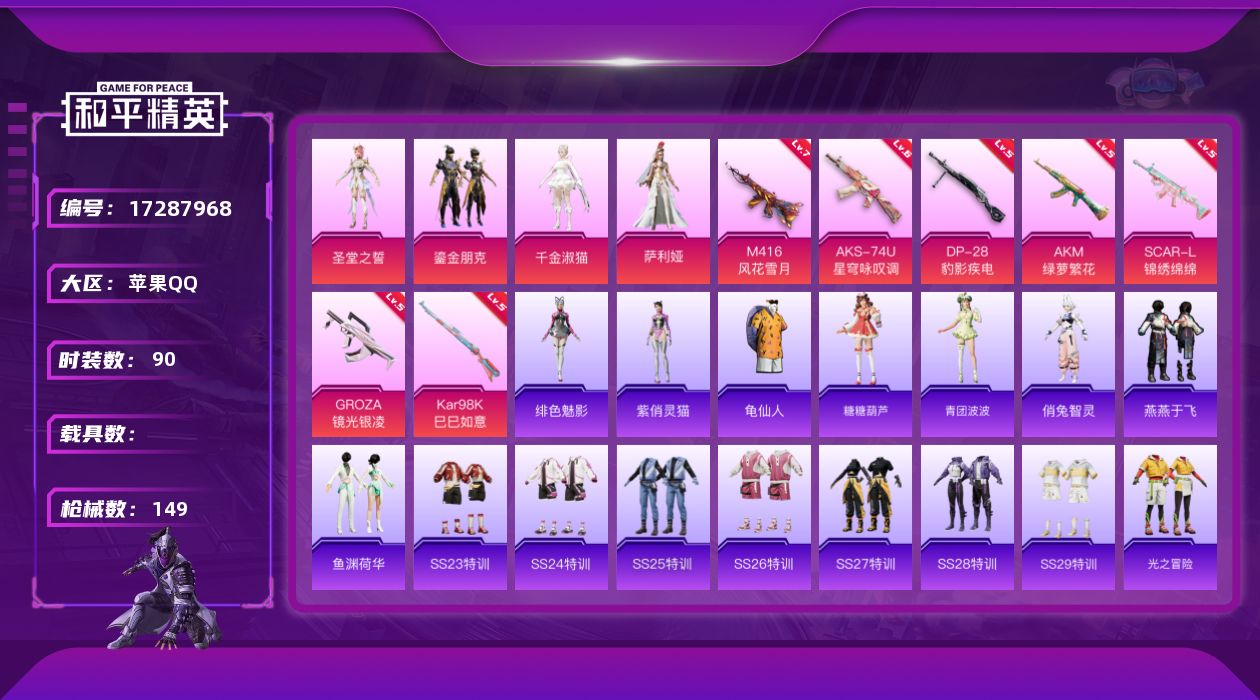 [17287968]苹果 手Q-4粉装-7特效枪-0载具-4粉色飞行器-45728热力值-8王牌印记-90套装-149枪皮 【热门品类】:套装-龟仙人 【粉色套装】:角色-圣堂之誓,粉装-鎏金朋克,角色-千金淑猫,角色-萨利娅 【粉色枪皮等级】:AKM-绿萝繁花(五级),SCAR-L-锦绣绵绵(五级),M416-风花雪月(七级),GROZA-镜光银凌(五级),AKS-74U-星穹咏叹调(六级),Kar98K-巳巳如意(五级),DP-28-豹影疾电(五级) 【粉色枪皮】:AKM-绿萝繁花,SCAR-L-锦绣绵绵,M416-风花雪月,GROZA-镜光银凌,AKS-74U-星穹咏叹调,Kar98K-巳巳如意,DP-28-豹影疾电 【粉色飞行器】:夜幕颂歌飞行器,祥瑞锦鲤飞行器,彩虹独角兽飞行器,戏水时光飞行器 【粉色降落伞】:至尊龙雀降落伞,恐龙拽拽降落伞,第五大道降落伞,龙珠超降落伞,梦幻舞会降落伞,飒粉甜心降落伞,变形金刚降落伞,莲影清波降落伞,猪猪侠降落伞,星空武士降落伞,精灵梦叶罗丽降落伞,千金淑猫降落伞,月影灵韵降落伞,星穹咏叹调降落伞,异瞳寒姬降落伞,炫彩糖果降落伞,罪夜之冕降落伞 【稀有套装】:套装-龟仙人,套装-糖糖葫芦,套装-青团波波,角色-俏兔智灵,套装-燕燕于飞,套装-鱼渊荷华,角色-绯色魅影,角色-紫俏灵猫,角色-霜刃之御 【稀有枪皮】:AKM-奇异狩猎者,AKM-彩虹符号,AKM-龙的传人,SCAR-L-红色方程式,M416-糯团青竹,M416-绯红前夜,GROZA-懵萌河马,AUG-辉耀战甲,AUG-天降萌叽,AUG-耀粉歌者,QBZ-未来歌姬,M762-天降萌叽,M762-奇异狩猎者,M762-第五大道,Mk47-妙红点点,G36C-懵萌河马,G36C-星穹咏叹调,AC-VAL-快闪甜心,UZI-啾咪啾咪,UZI-天降萌叽,UZI-红色方程式,UMP45-涂山之恋,UMP45-猪猪侠,UMP45-生命誓言,Vector-焰鹰斗篷,Vector-生命誓言,汤姆逊-天降萌叽,汤姆逊-奇异狩猎者,汤姆逊-耀粉歌者,汤姆逊-樱桃泡泡,P90-快闪甜心,P90-飞驰魅影,P90-巳巳如意,M24-奇异狩猎者,AWM-焰鹰斗篷,AWM-圣堂之誓,SKS-炫彩节奏,VSS-彩虹符号,Mini14-涂山之恋,Mini14-熔岩统帅,Mini14-耀粉歌者,Mk14-治愈之星,