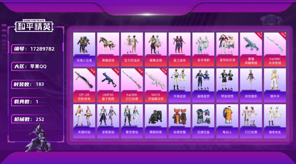 [17289782]苹果 手Q-无敌战神框-5粉装-10特效枪-1载具-5粉色飞行器-76509热力值-21王牌印记-183套装-252枪皮