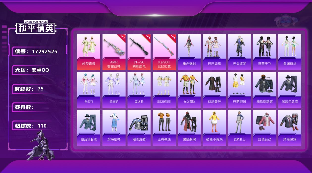 [17292525]安卓 手Q-2粉装-6特效枪-0载具-2粉色飞行器-29670热力值-5王牌印记-75套装-110枪皮 【粉色套装】:粉装-闲梦青缨,角色-虹云熊熊 【粉色枪皮等级】:AKS-74U-森灵之息(四级),Kar98K-巳巳如意(五级),AMR-智耀战神(七级),DP-28-豹影疾电(五级) 【粉色枪皮】:ACE32-萌骑漫游,AKS-74U-森灵之息,Kar98K-巳巳如意,Mk14-福马献瑞,AMR-智耀战神,DP-28-豹影疾电 【粉色飞行器】:炫彩糖果飞行器,脆鲨七海飞行器 【粉色降落伞】:脆鲨七海降落伞,月影灵韵降落伞,魔童闹海 敖丙降落伞,炫彩糖果降落伞 【稀有套装】:套装-巳巳如意,套装-雪国风尚,套装-炫彩糖果,套装-马上有钱,角色-光矢逐梦,套装-燕燕于飞,套装-鱼渊荷华,套装-粉恋花,套装-紫幽梦,套装-蓝冰羽,角色-绯色魅影,角色-霜刃之御,套装-雨过天青,套装-红釉青花 【稀有枪皮】:AKM-破晓战魂,AKM-缤纷海域,M16A4-雨林猎影,SCAR-L-夜灯,SCAR-L-炫彩节奏,SCAR-L-玉兔迎春,SCAR-L-小狗蛇点点,M416-蓝色火焰,AUG-耀粉歌者,M762-彩虹符号,UZI-红色方程式,UZI-月影灵韵,UMP45-夜灯,UMP45-生命誓言,UMP45-蓝色火焰,汤姆逊-耀粉歌者,JS9-蓝晶绮麟,P90-巳巳如意,Kar98K-洛神天依,Mini14-穿刺龙虾,Mk14-治愈之星,S686-生命誓言,S686-巳巳如意,S12K-玩趣呆呆,S12K-破晓战魂,S12K-夜灯,DBS-彩虹符号,M249-破晓战魂,MG3-幻世战舞者,MG3-惊鸿侠骨,MG3-第五大道,撬棍-脆鲨七海,破片手榴弹-巳巳如意 【其他套装】:套装-SS29特训,套装-光之冒险,套装-战地督导,套装-柠萌假日,套装-海岛探路者,套装-深蓝色名流,套装-湖蓝色名流,套装-滨海厨神,套装-潮流炫酷,套装-王牌教练,套装-破晓战魂,套装-破蛋小黄鸡,套装-竞技名士,套装-红色运动,套装-绮丽涂鸦,套装-缤纷果语,套装-蓝彩潮人,套装-蓝色运动,套装-街头潮人,套装-酒红色名流,套装-长空猛禽,套装-青涩时光,套装-魅力单车,套装-黄色伏地魔,套装-黄色名流,套装-黄色运动,套装-弄潮海豚,套装-莱茵河畔 【稀有背包】:深海小丑鱼背包(3级) 【营地