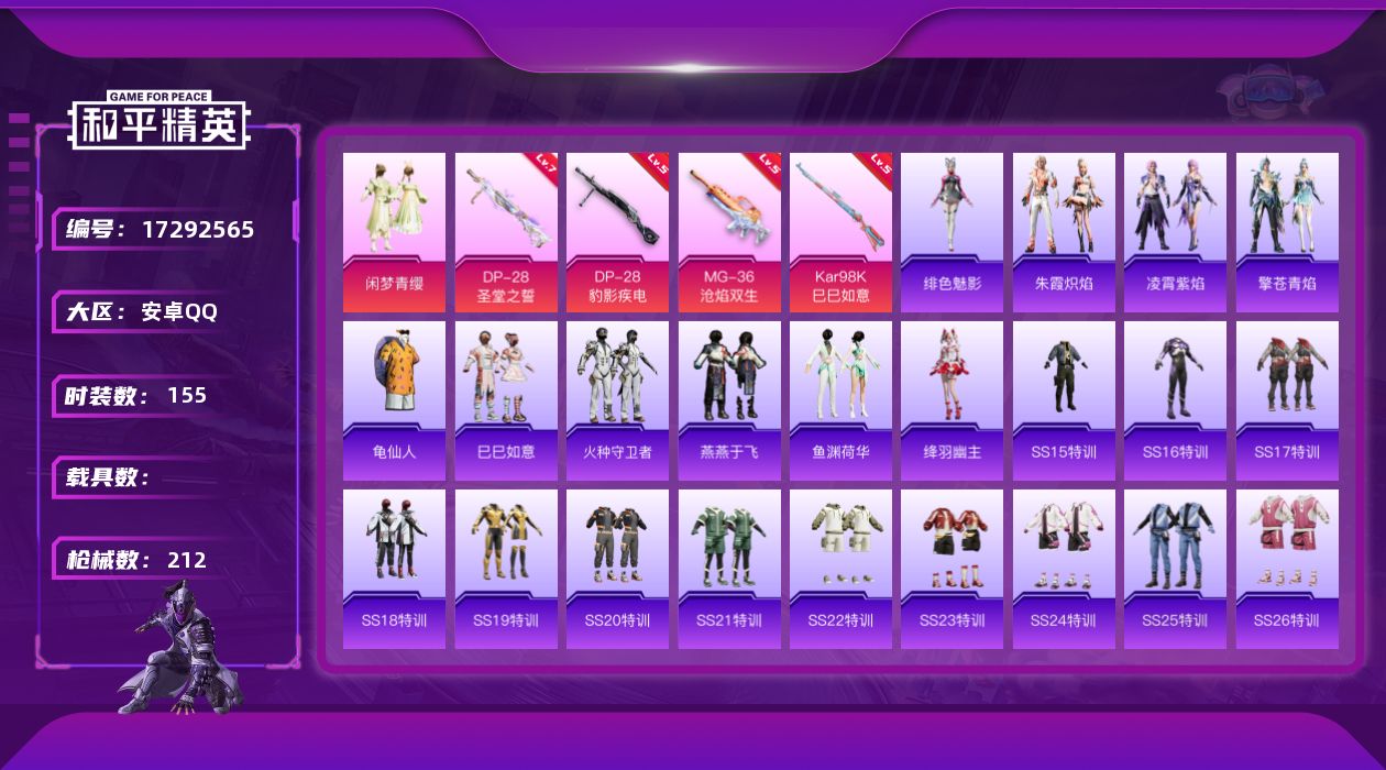 [17292565]安卓 手Q-2粉装-6特效枪-0载具-1粉色飞行器-57507热力值-11王牌印记-155套装-212枪皮 【热门品类】:套装-龟仙人 【粉色套装】:粉装-闲梦青缨,角色-罪夜之冕 【粉色枪皮等级】:Kar98K-巳巳如意(五级),DP-28-圣堂之誓(七级),DP-28-豹影疾电(五级),MG-36-沧焰双生(五级) 【粉色枪皮】:UMP45-萌骑冒险,Kar98K-巳巳如意,Mk14-福马献瑞,DP-28-圣堂之誓,DP-28-豹影疾电,MG-36-沧焰双生 【粉色飞行器】:炫彩糖果飞行器 【粉色降落伞】:仲夏莫吉托降落伞,精灵梦叶罗丽降落伞,创世·救赎降落伞,无垠阁降落伞,炫彩糖果降落伞 【稀有套装】:套装-龟仙人,套装-巳巳如意,套装-雪国风尚,套装-炫彩糖果,角色-奈斯,套装-马上有钱,套装-火种守卫者,套装-燕燕于飞,套装-鱼渊荷华,角色-绛羽幽主,套装-朱霞炽焰,套装-凌霄紫焰,套装-擎苍青焰,角色-绯色魅影,套装-雨过天青,套装-红釉青花,角色-孙斩天 【稀有枪皮】:AUG-冰晶雪宝,AKM-2P战斗服款,AKM-彩虹符号,AKM-破晓战魂,AKM-萌趣颜团子,AKM-霓虹街区,AKM-龙的传人,M16A4-幻世战舞者,M16A4-红色方程式,M16A4-蓝色火焰,SCAR-L-夜灯,SCAR-L-炫彩节奏,SCAR-L-玉兔迎春,SCAR-L-红色方程式,M416-糯团青竹,M416-红色方程式,M416-蓝色火焰,GROZA-彩虹符号,AUG-天降萌叽,AUG-耀粉歌者,QBZ-彩虹符号,QBZ-洛神天依,M762-天降萌叽,M762-彩虹符号,M762-烈焰拳霸,G36C-星穹咏叹调,AC-VAL-天降萌叽,AC-VAL-快闪甜心,蜜獾-天降萌叽,蜜獾-虎痴许褚,蜜獾-绯穹魔姬,ARX-凌霄紫焰,UZI-啾咪啾咪,UZI-天降萌叽,UZI-炫彩节奏,UZI-红色方程式,UMP45-夜灯,UMP45-涂山之恋,UMP45-生命誓言,UMP45-蓝色火焰,UMP45-极意拳锋,Vector-焰鹰斗篷,Vector-彩虹符号,汤姆逊-天降萌叽,汤姆逊-炫彩节奏,汤姆逊-耀粉歌者,JS9-凌霄紫焰,P90-快闪甜心,P90-巳巳如意,Kar98K-彩虹符号,Kar98K-炫彩节奏,Kar98K-王子的夏天,Kar98K-红色方程式,M24-炫彩节奏,