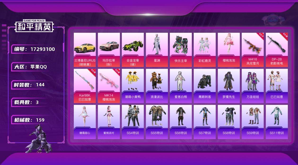 [17293100]苹果 手Q-4粉装-7特效枪-3载具-1粉色飞行器-53109热力值-8王牌印记-144套装-159枪皮