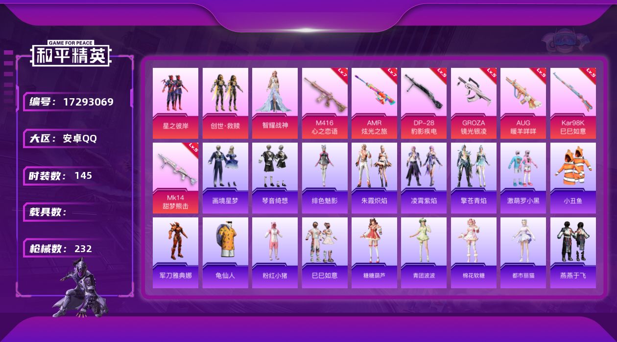 [17293069]安卓 手Q-4粉装-9特效枪-0载具-4粉色飞行器-64486热力值-14王牌印记-145套装-232枪皮