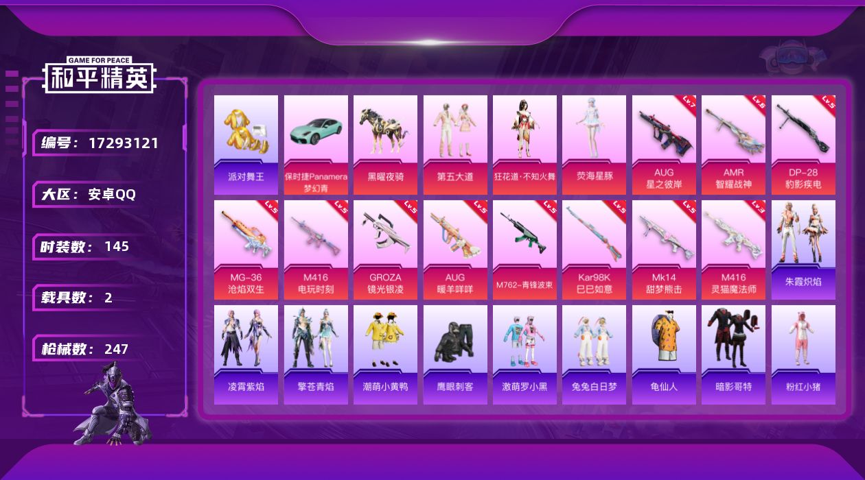 [17293121]安卓 手Q-4粉装-15特效枪-2载具-4粉色飞行器-72868热力值-9王牌印记-145套装-247枪皮