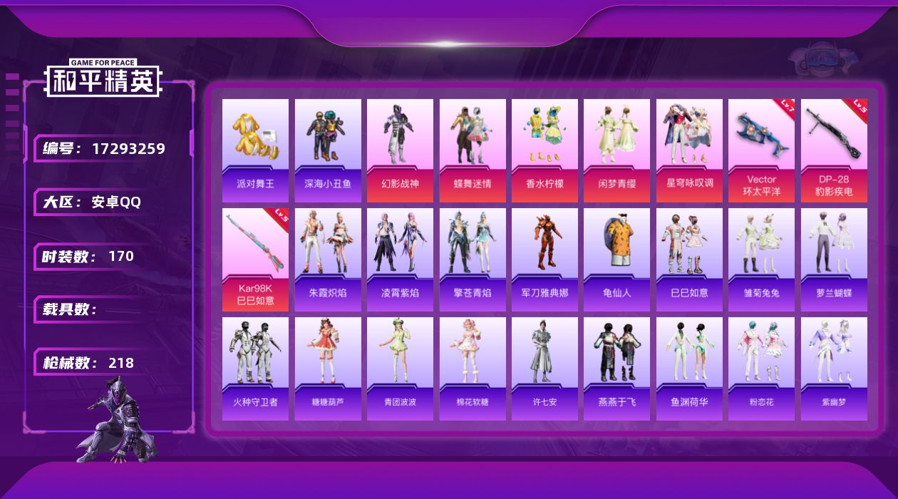 [17293259]安卓 手Q-5粉装-4特效枪-0载具-1粉色飞行器-66214热力值-16王牌印记-170套装-218枪皮 【热门品类】:套装-派对舞王,套装-深海小丑鱼,角色-军刀雅典娜,套装-龟仙人 【粉色套装】:粉装-幻影战神,粉装-蝶舞迷情,粉装-香水柠檬,粉装-闲梦青缨,粉装-星穹咏叹调 【粉色枪皮等级】:Vector-环太平洋(七级),Kar98K-巳巳如意(五级),Mk14-福马献瑞(五级),DP-28-豹影疾电(五级) 【粉色枪皮】:Vector-环太平洋,Kar98K-巳巳如意,Mk14-福马献瑞,DP-28-豹影疾电 【粉色飞行器】:炫彩糖果飞行器 【粉色降落伞】:香水柠檬降落伞,洛神天依降落伞,天之羽翼降落伞,环太平洋降落伞,音爆索尼克降落伞,仲夏莫吉托降落伞,精灵梦叶罗丽降落伞,千金淑猫降落伞,智耀战神降落伞,星穹咏叹调降落伞,炫彩糖果降落伞 【稀有套装】:套装-龟仙人,套装-巳巳如意,套装-雪国风尚,套装-炫彩糖果,套装-雏菊兔兔,套装-萝兰蝴蝶,套装-火种守卫者,套装-糖糖葫芦,套装-青团波波,套装-棉花软糖,角色-许七安,套装-燕燕于飞,套装-鱼渊荷华,套装-粉恋花,套装-紫幽梦,套装-蓝冰羽,角色-瑰梦爱神,套装-星渊小夜曲,套装-朱霞炽焰,套装-凌霄紫焰,套装-擎苍青焰 【稀有枪皮】:AUG-冰晶雪宝,AKM-夜灯,AKM-彩虹符号,AKM-环太平洋,AKM-破晓战魂,AKM-龙的传人,M16A4-夜灯,M16A4-幻世战舞者,M16A4-红色方程式,M16A4-蓝色火焰,SCAR-L-夜灯,SCAR-L-炫彩节奏,SCAR-L-玉兔迎春,SCAR-L-红色方程式,M416-糯团青竹,M416-红色方程式,M416-蓝色火焰,GROZA-彩虹符号,GROZA-恐龙拽拽,GROZA-懵萌河马,GROZA-治愈之星,GROZA-田园牧歌,AUG-天降萌叽,AUG-耀粉歌者,QBZ-彩虹符号,M762-天降萌叽,M762-彩虹符号,M762-暗夜鎏金,M762-登顶巅峰,Mk47-洛神天依,G36C-懵萌河马,AC-VAL-天降萌叽,AC-VAL-彩虹甜喵,AC-VAL-快闪甜心,蜜獾-千面幻镜,蜜獾-天降萌叽,ARX-凌霄紫焰,UZI-天降萌叽,UZI-影袭,UZI-红色方程式,UZI-月影灵韵,UMP45-夜灯,UMP45-涂山之恋,UMP45-生