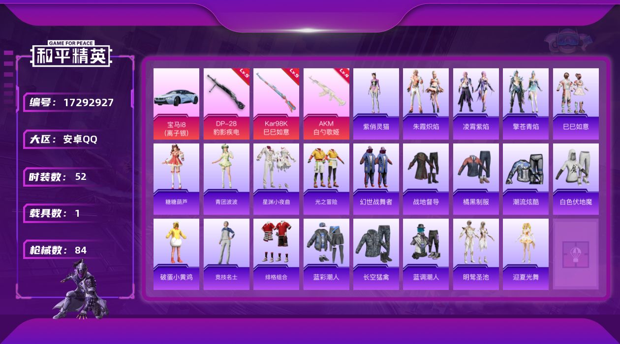 [17292927]安卓 手Q-1粉装-6特效枪-1载具-1粉色飞行器-24609热力值-6王牌印记-52套装-84枪皮