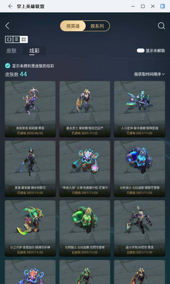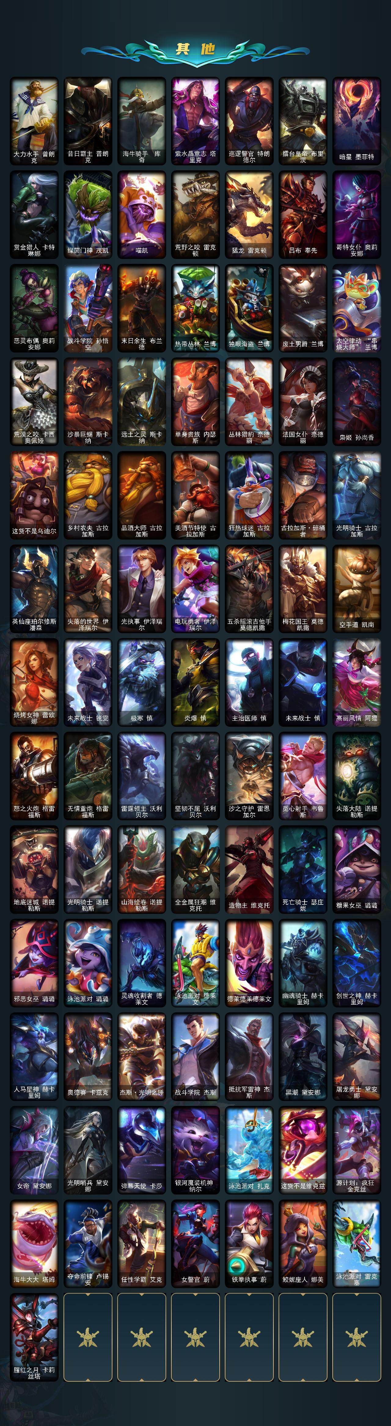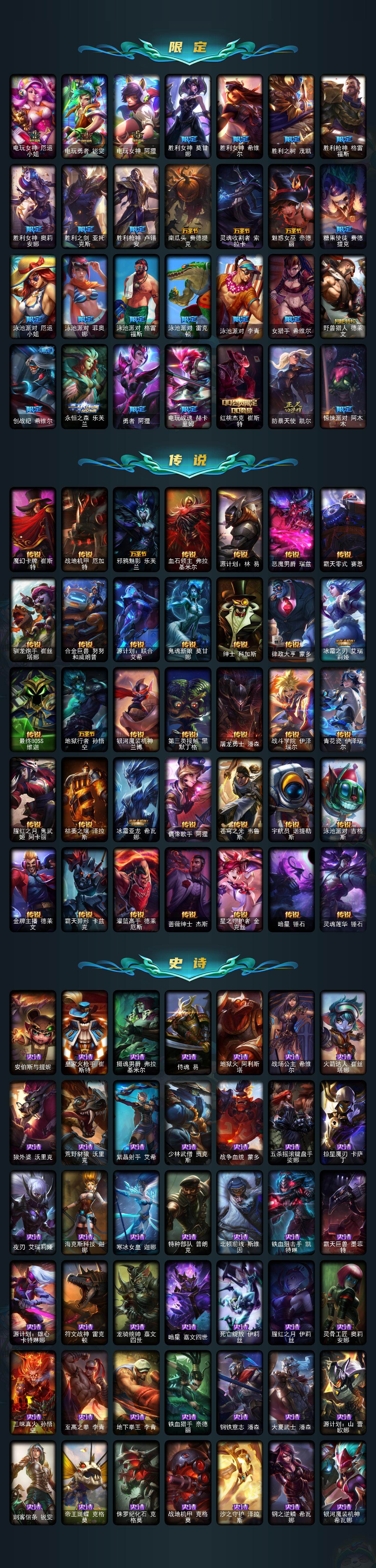 【年限皮肤】:广寒仙子嫦娥,神龙烈焰金克丝,美猴王孙悟空,紫金罗刹莫甘娜,玉净夜叉凯特琳,虎痴之拳蔚,烈焰仙子黛安娜